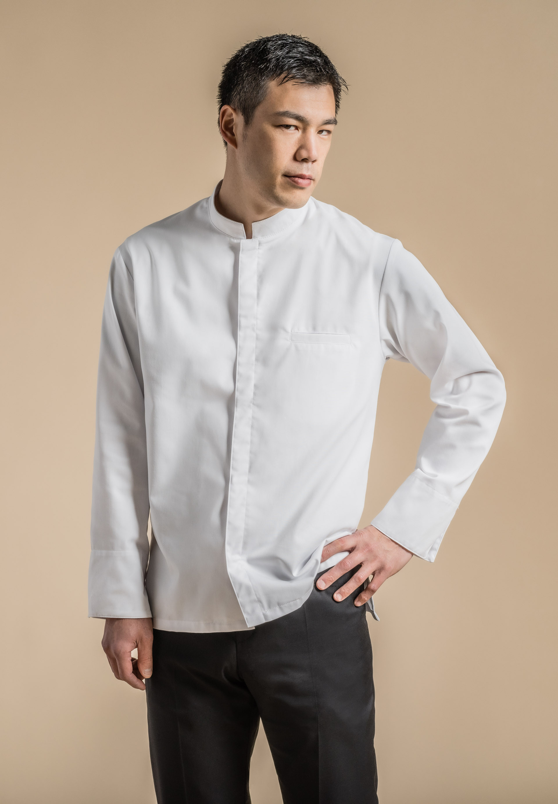 Men's chef jacket manufactured in a « Haute Couture » spirit with madarin collar