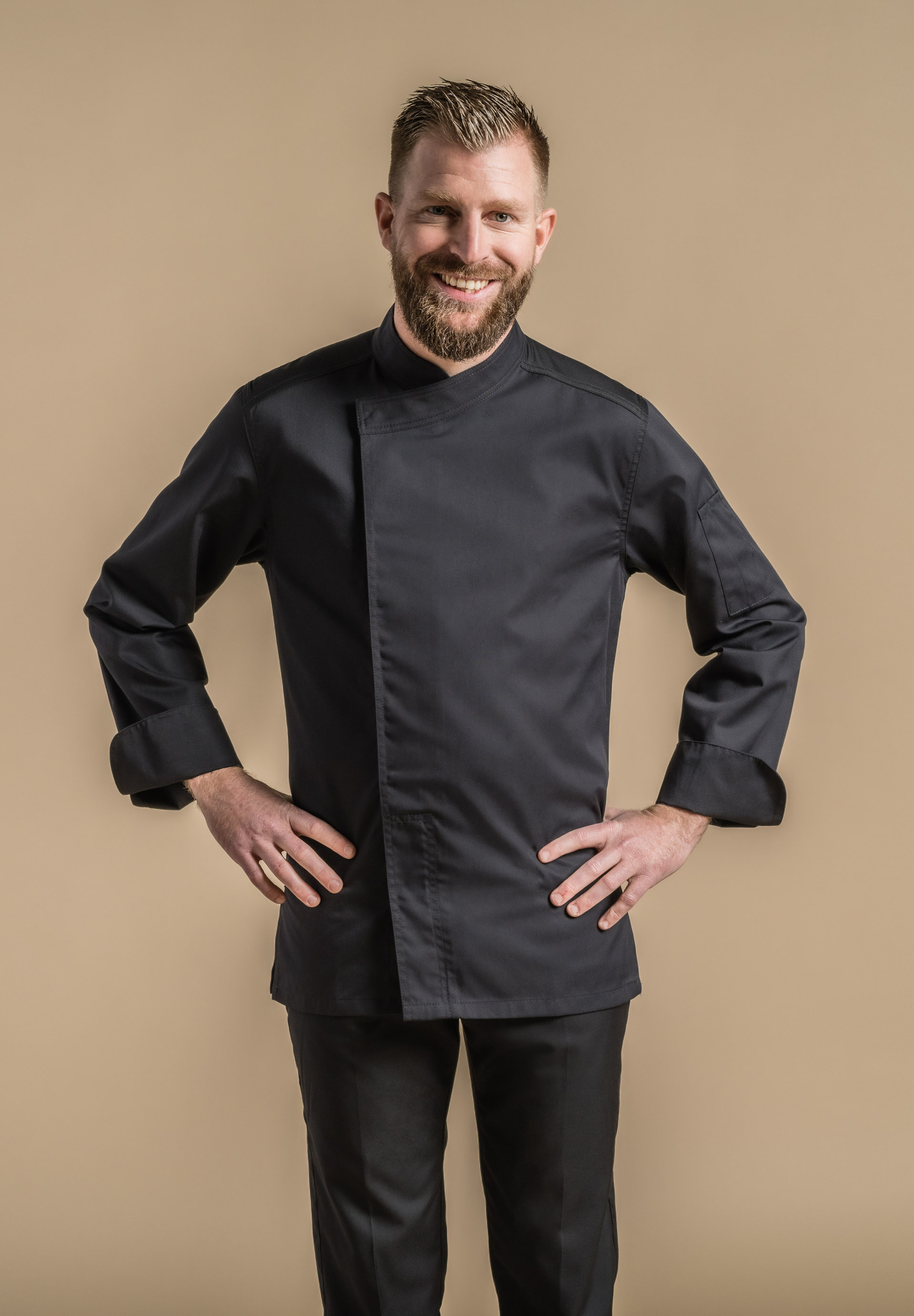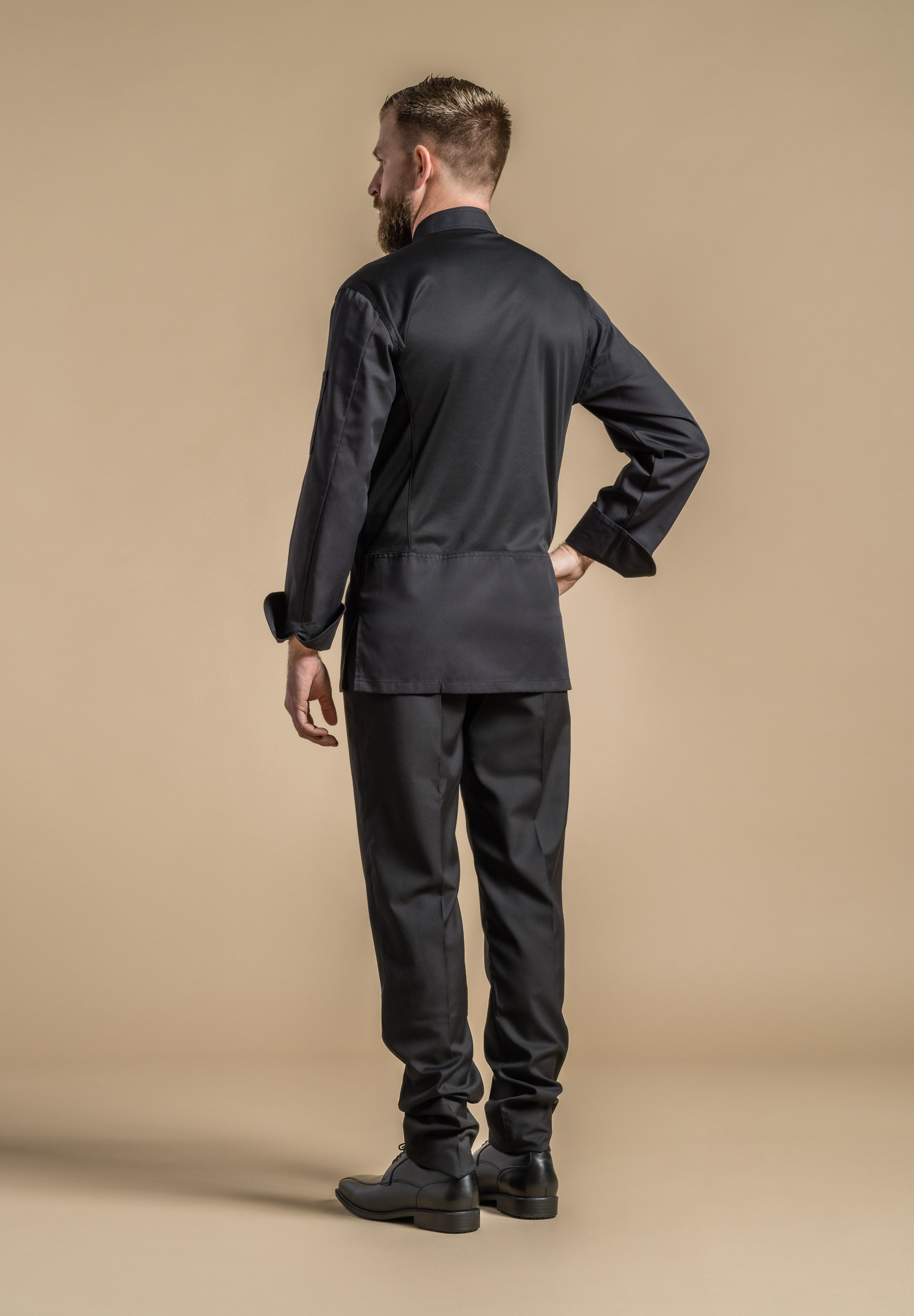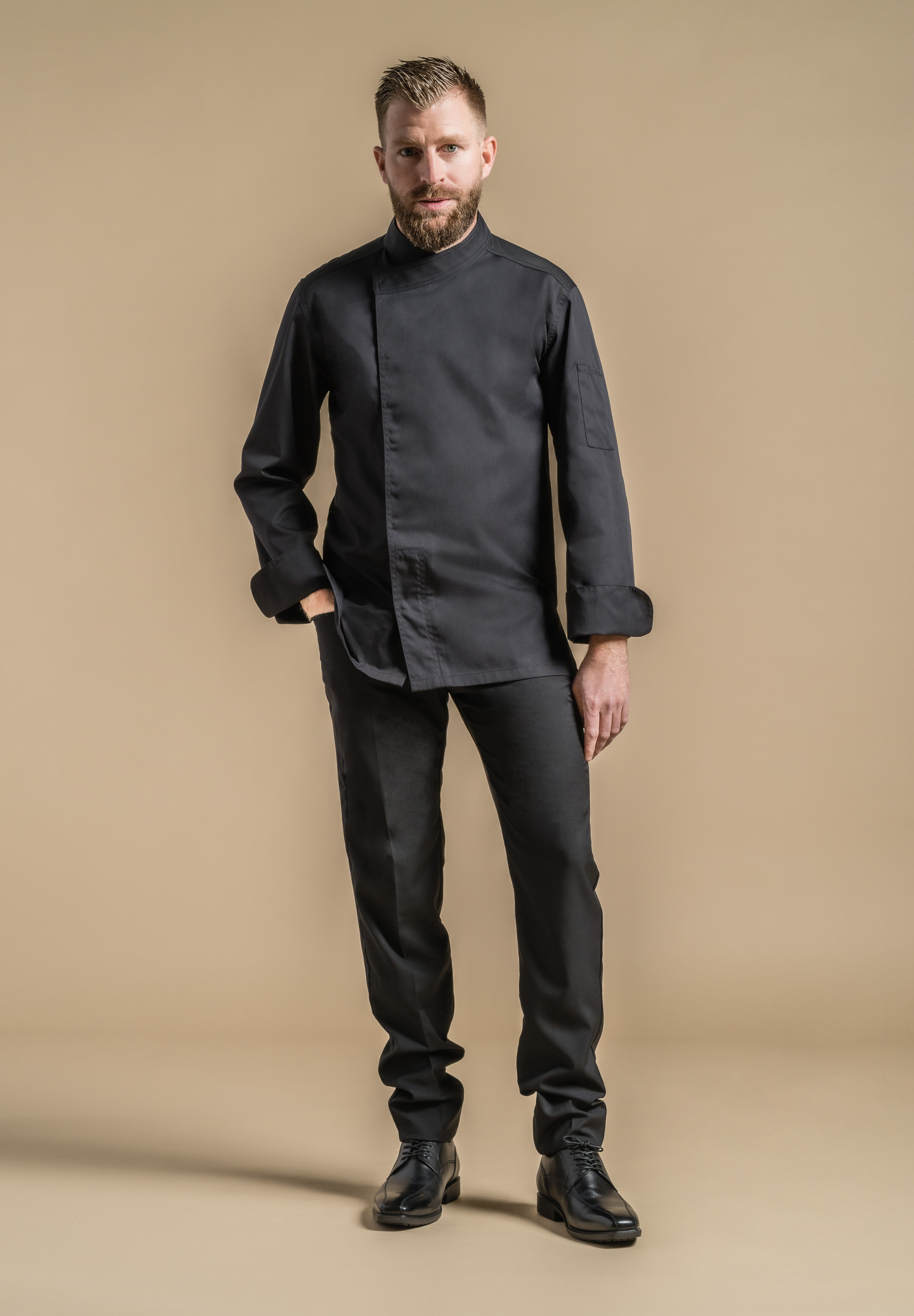 Women’s chef jacket with kimono collar, hidden snap buttons, pen pocket on left sleeve and side slits