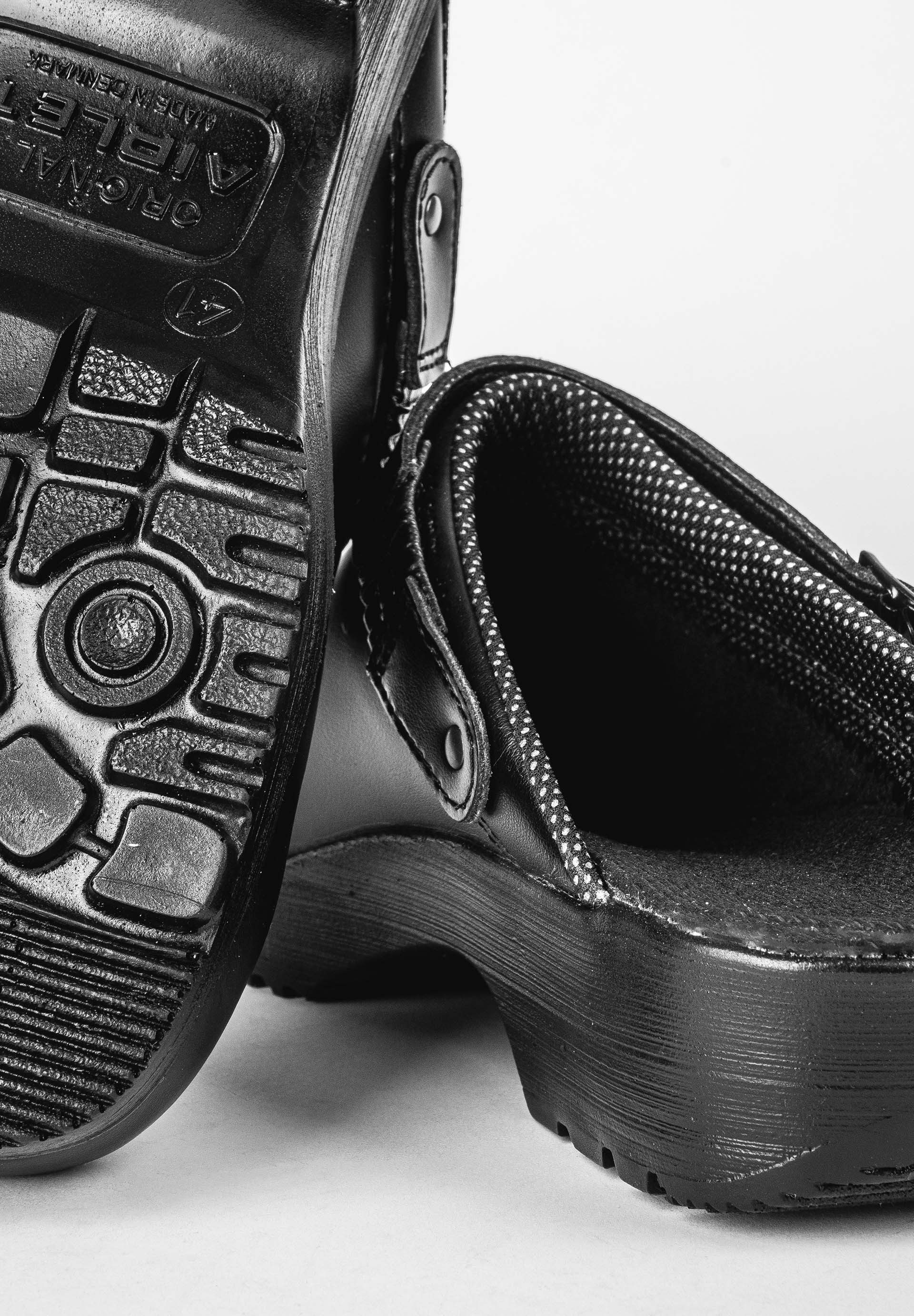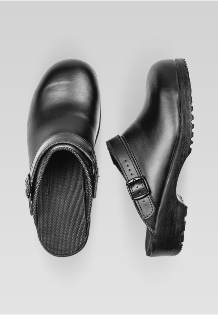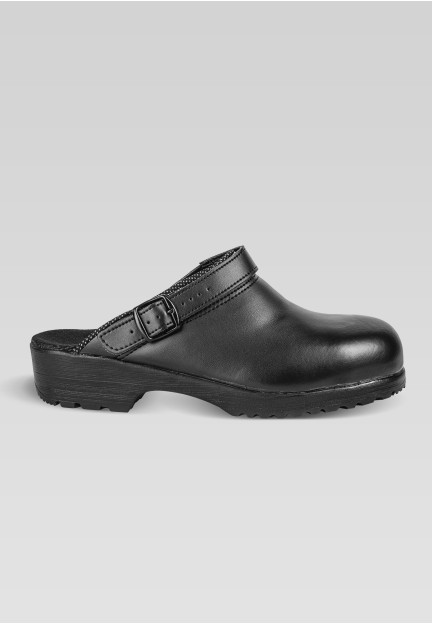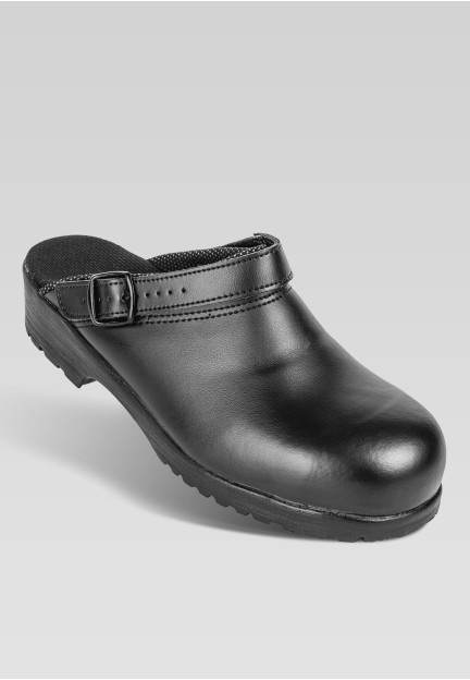 Safety clog with steel toe cap and elastic sling at the heel