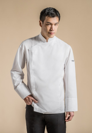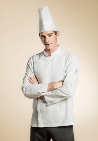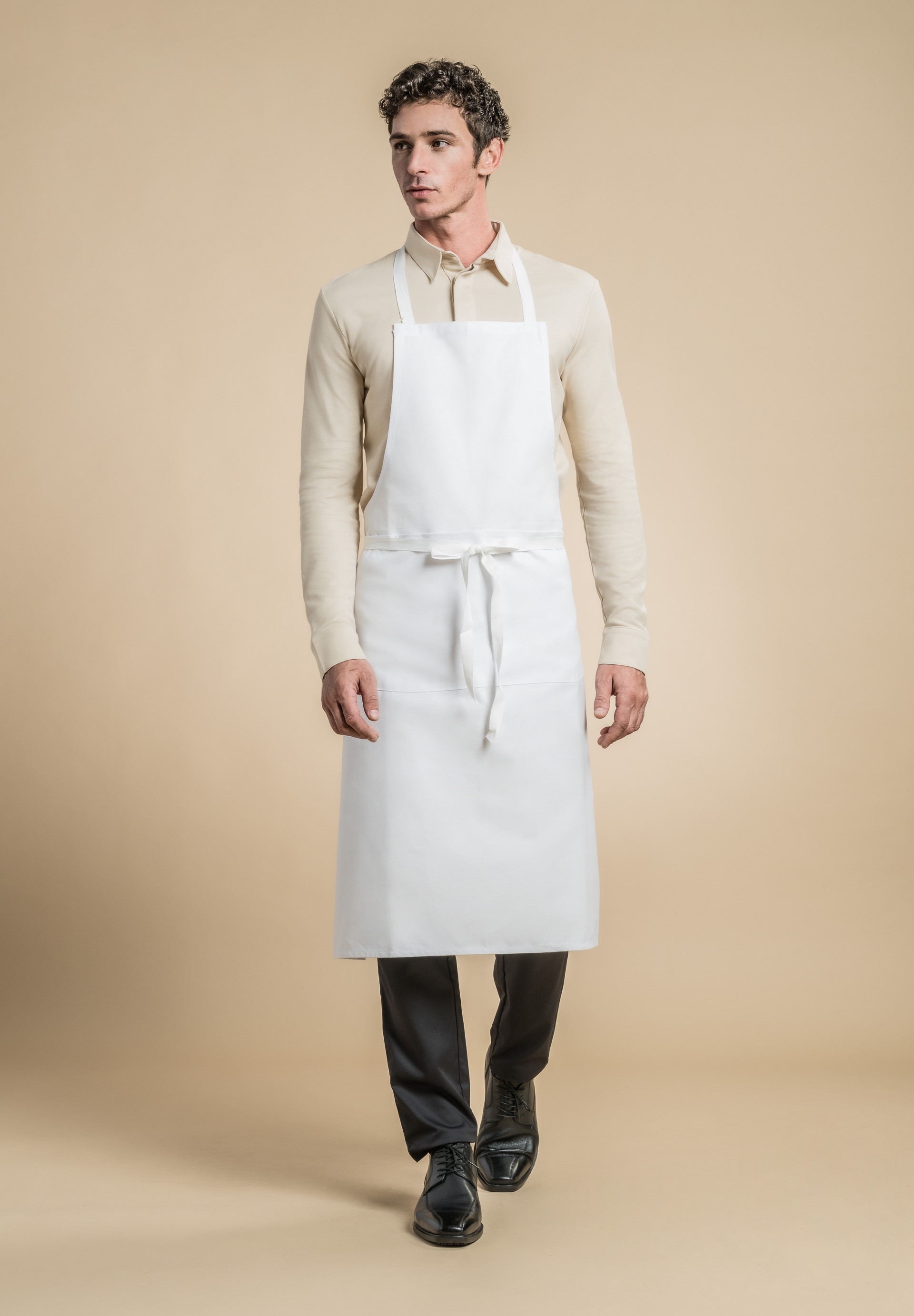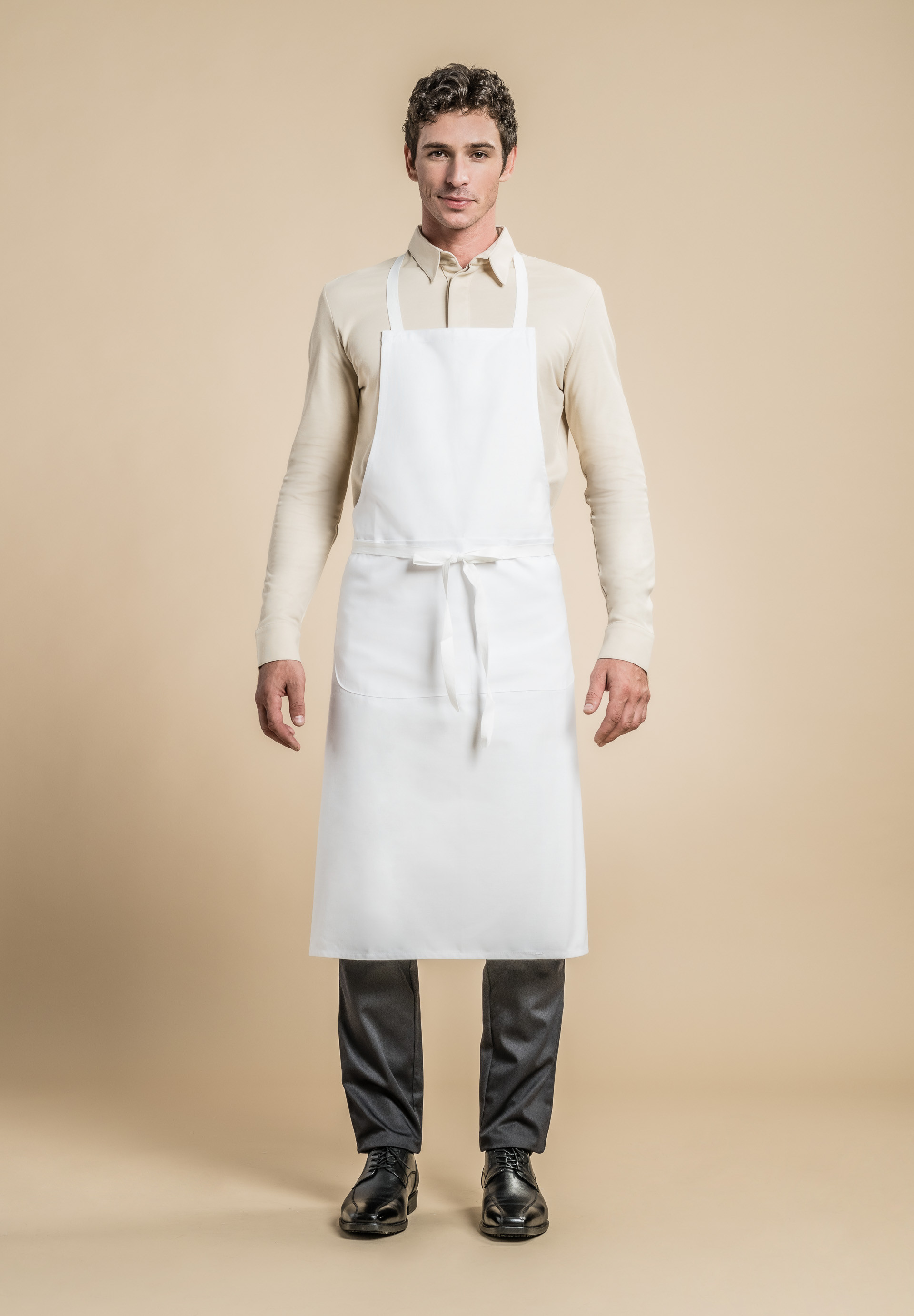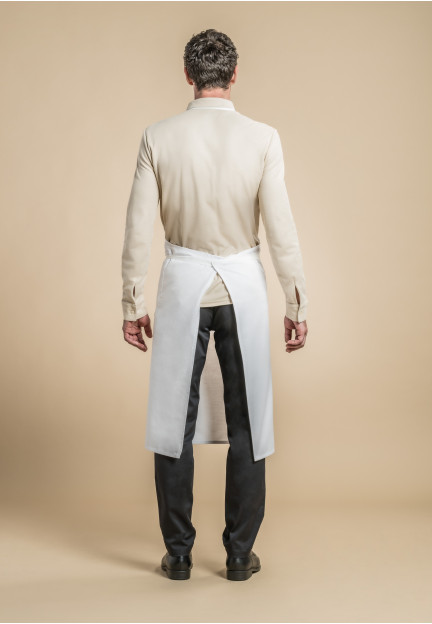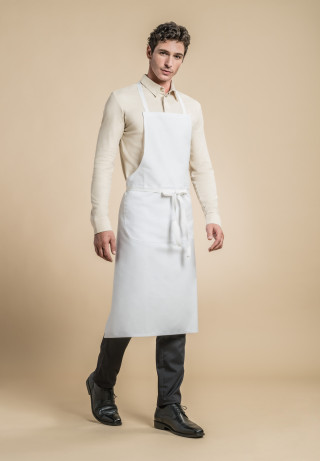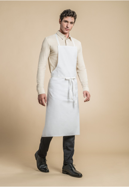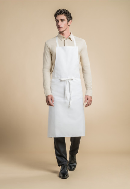 White cotton bib apron with a kangaroo pocket