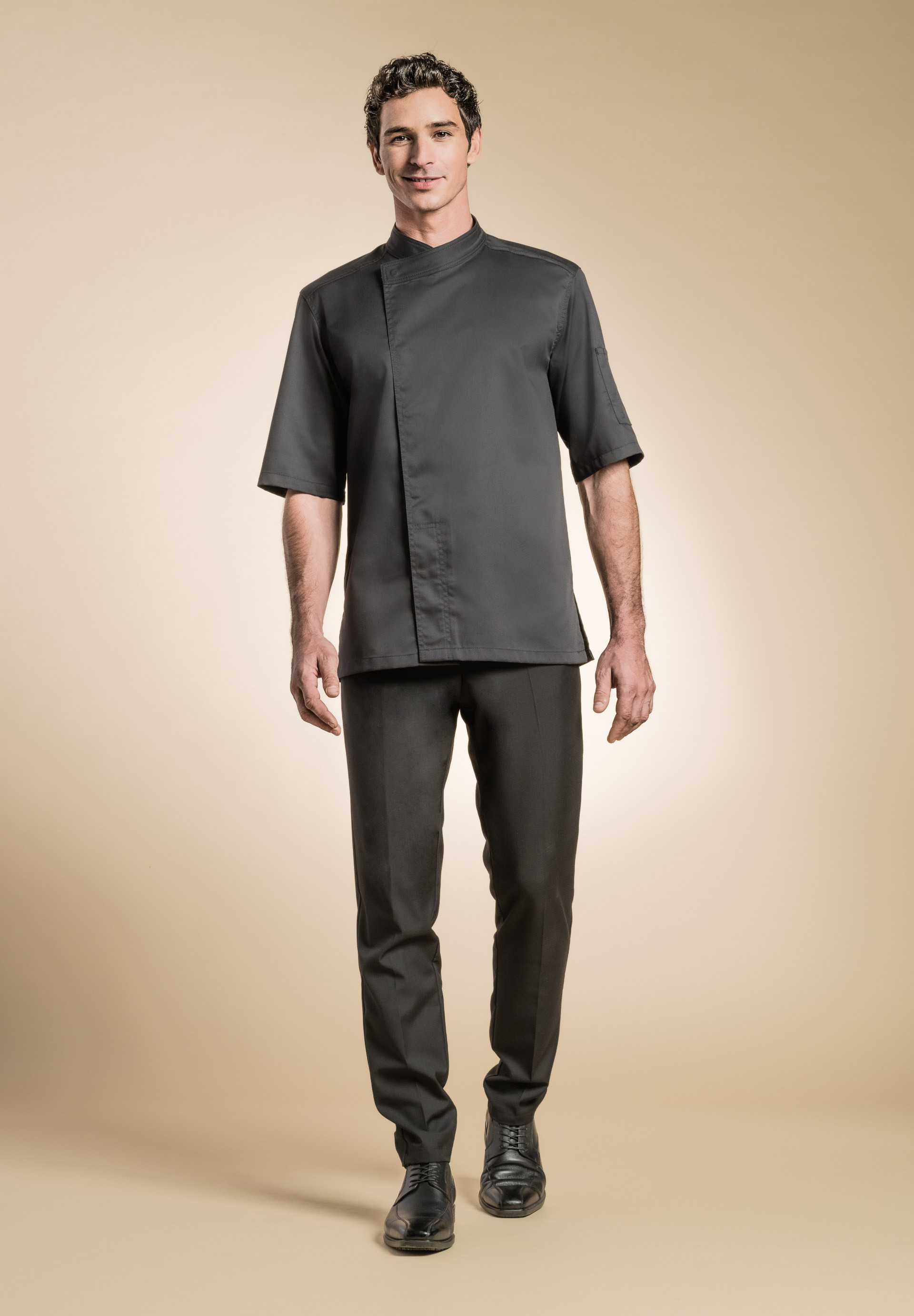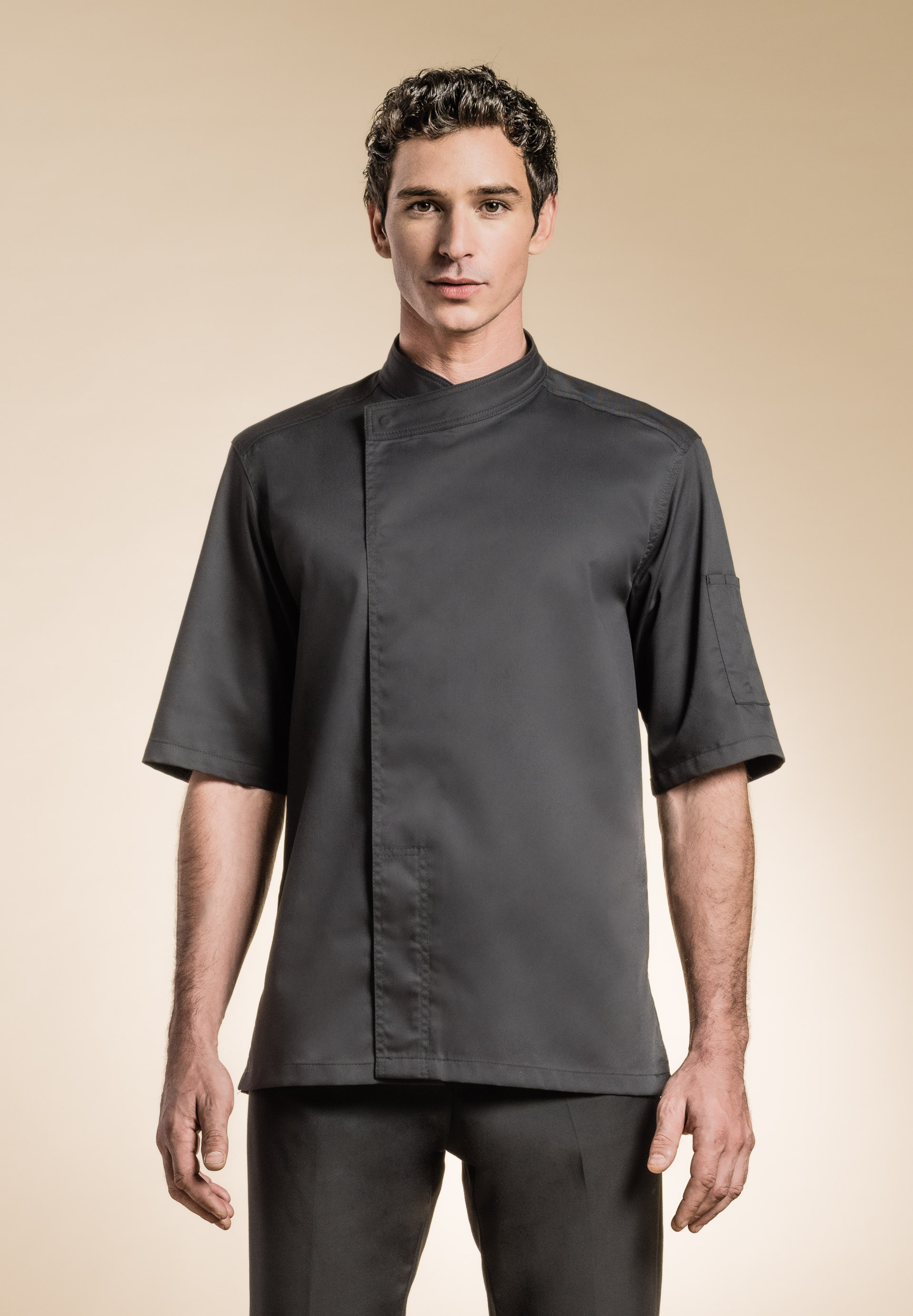 Chaqueta de hombre con cuello de estilo kimono, botones automáticos escondidos, Bolsillo para bolígrafo en la manga izquierda , aberturas laterales