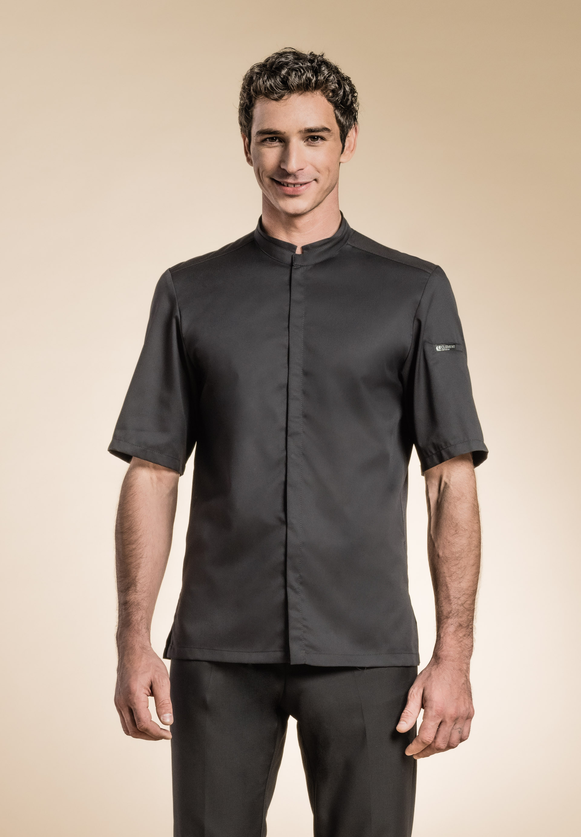 Chaqueta de hombre de cocina ligera y confortable con botones automáticos escondidos, bolsillo ribeteado en el pecho, aberturas laterales