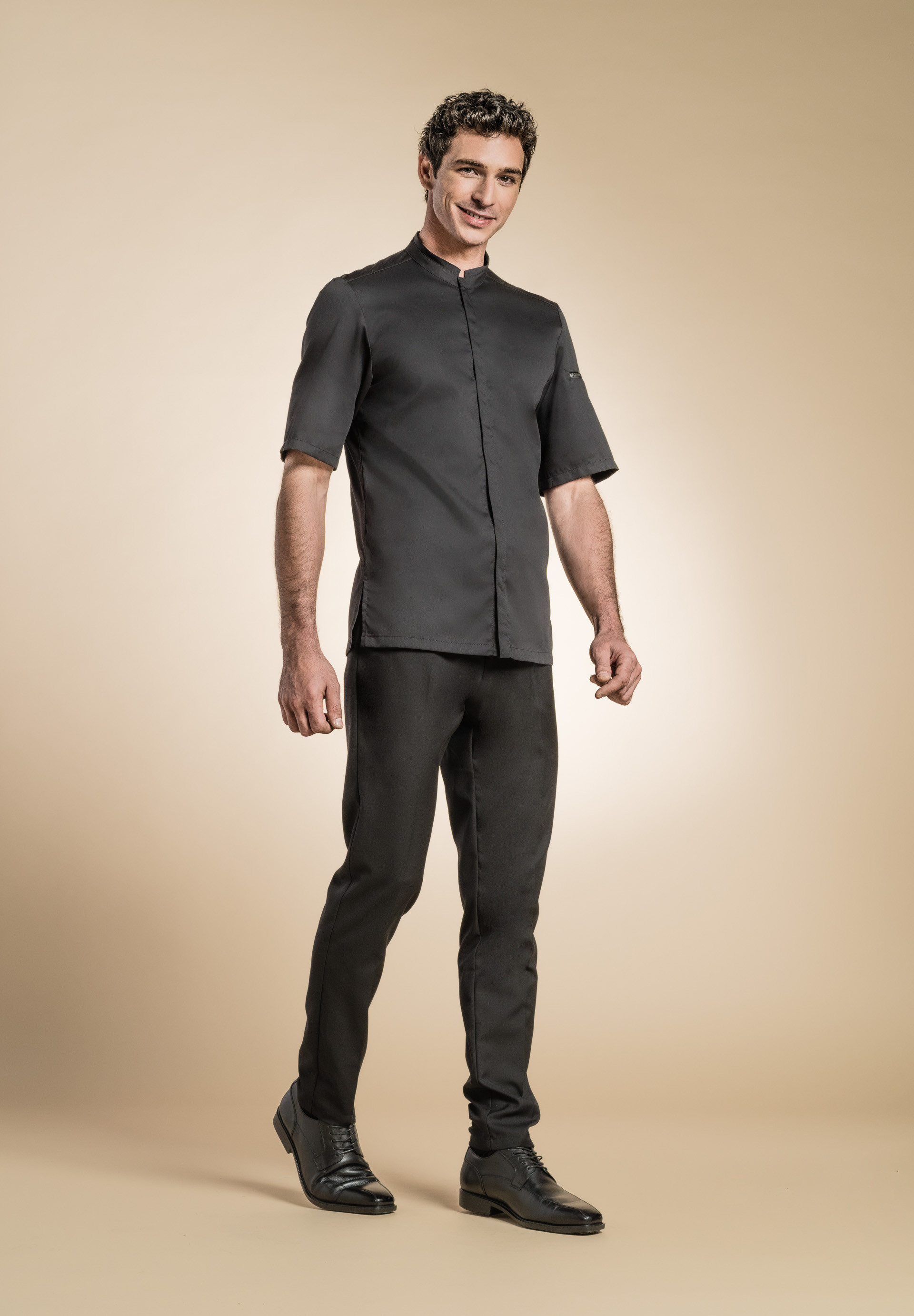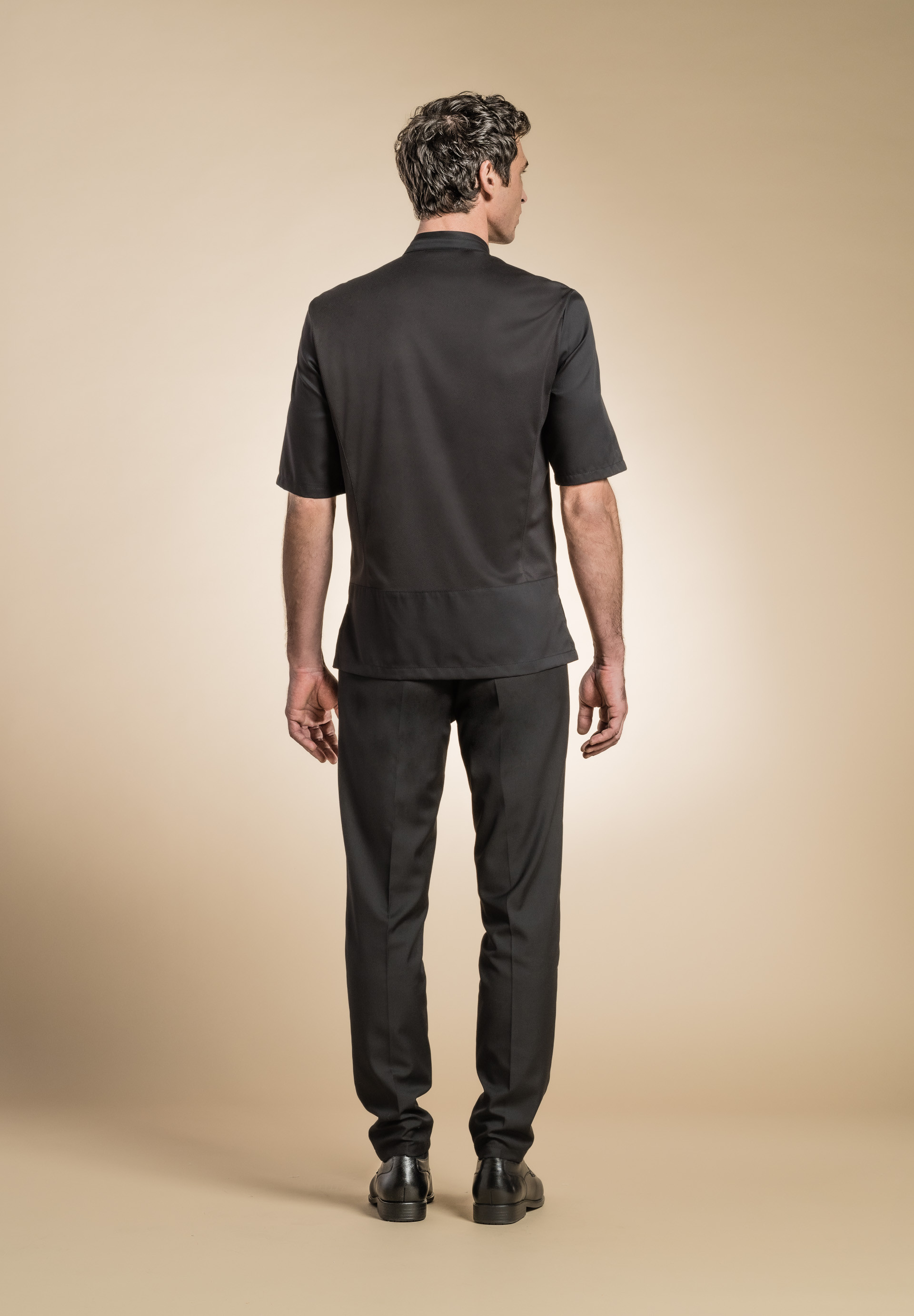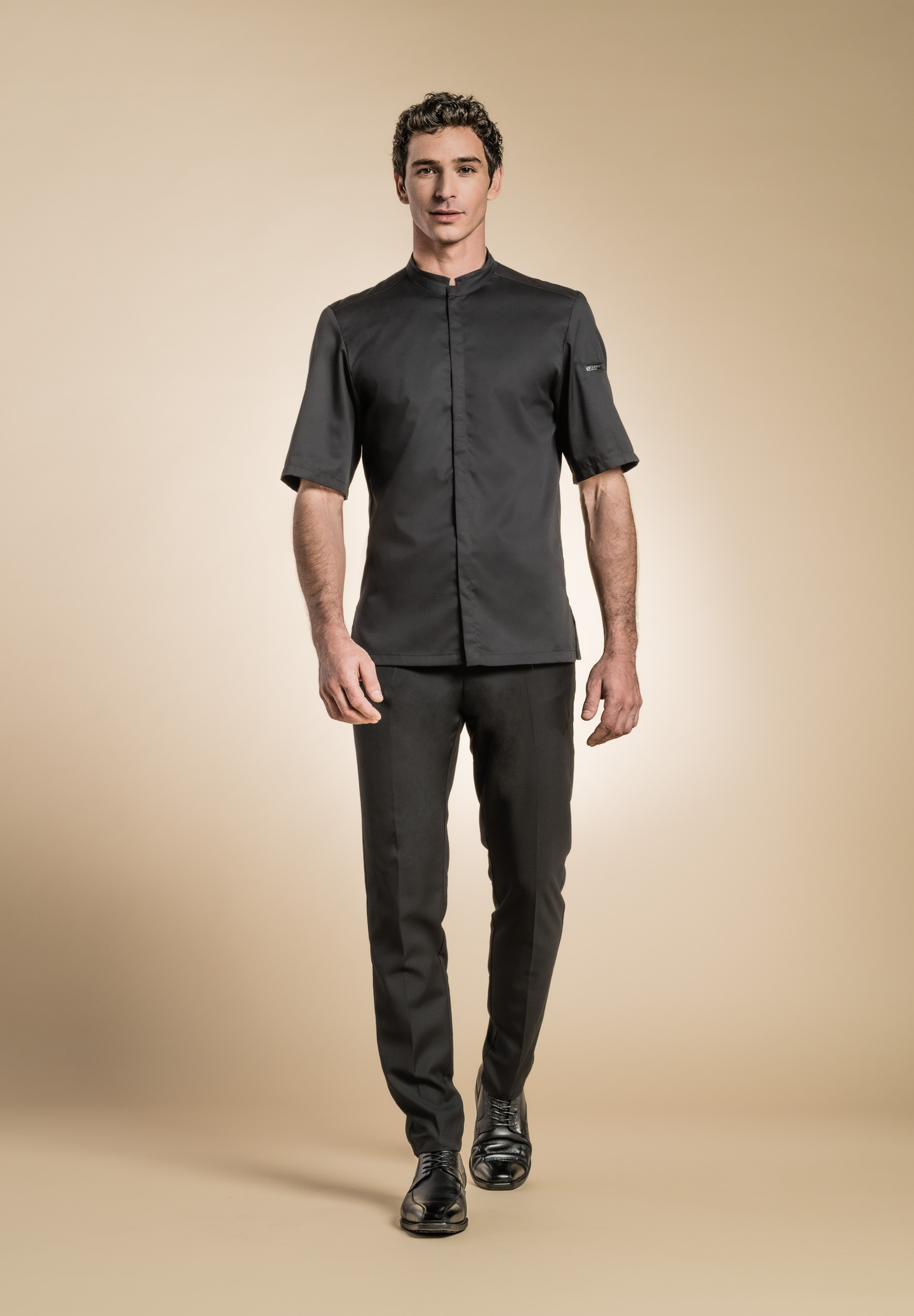 Chaqueta de hombre con cuello camisa, botones automáticos escondidos, bolsillo ribeteado en el pecho, bolsillo para bolígrafo en la manga izquierda, aberturas laterales