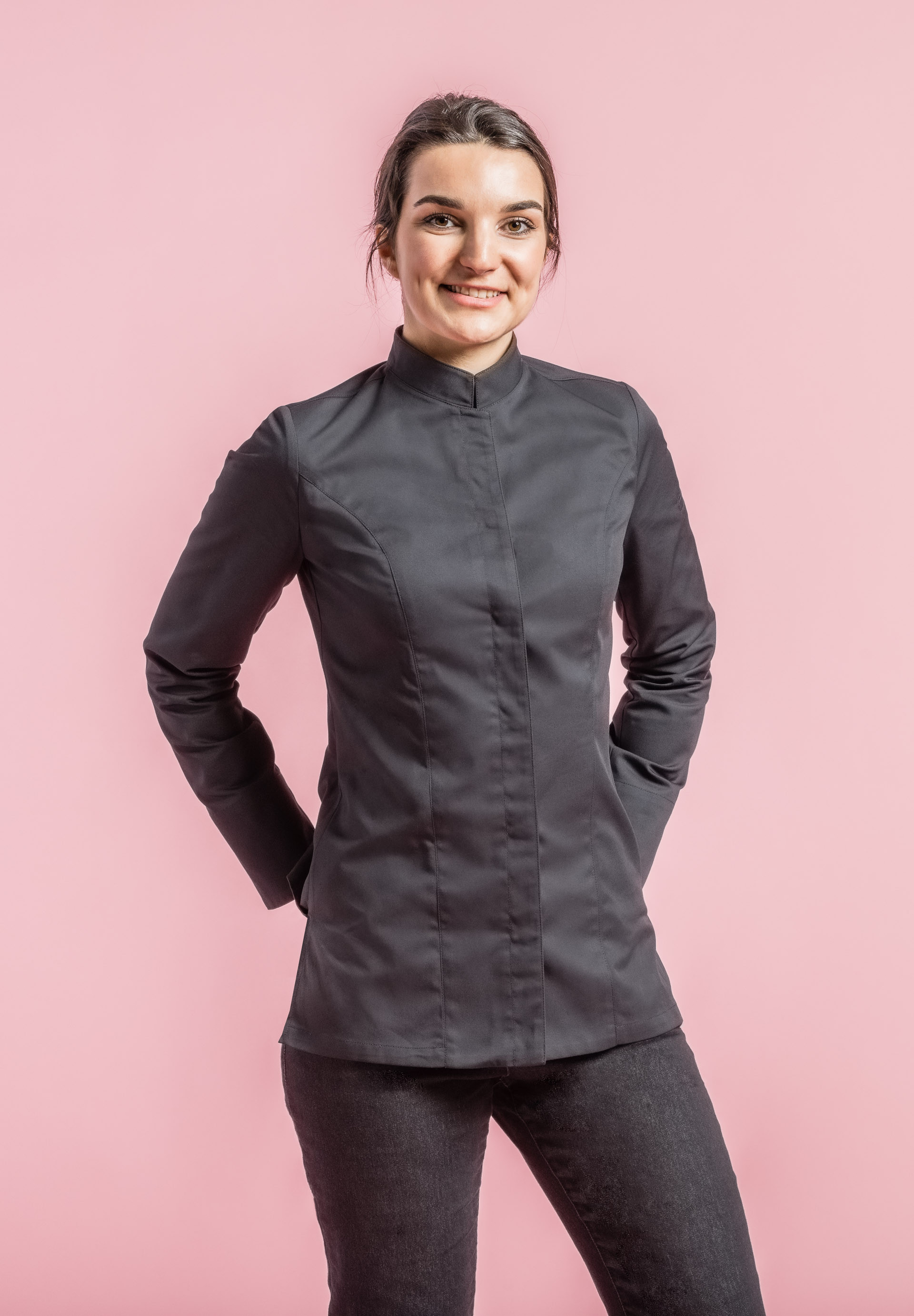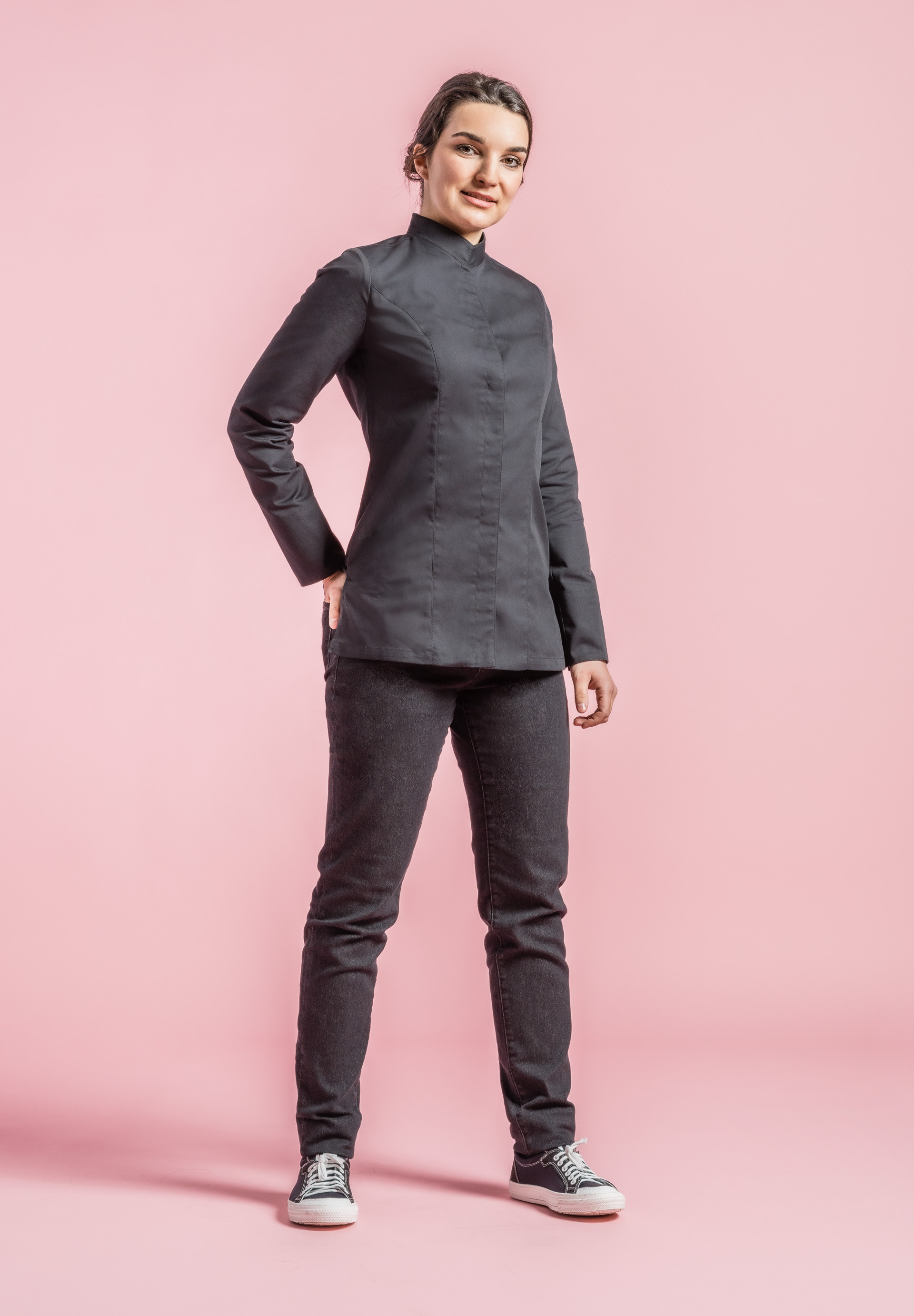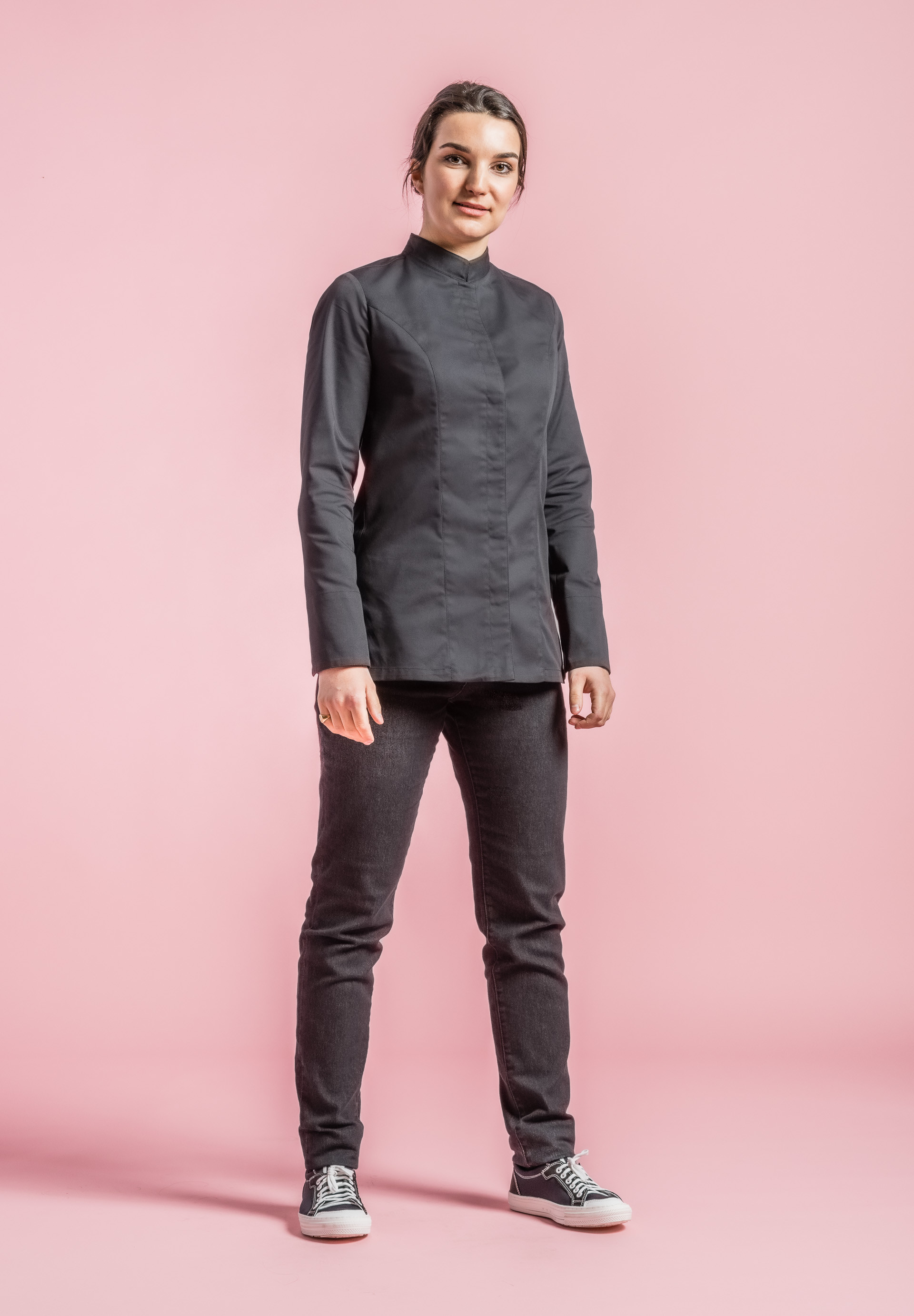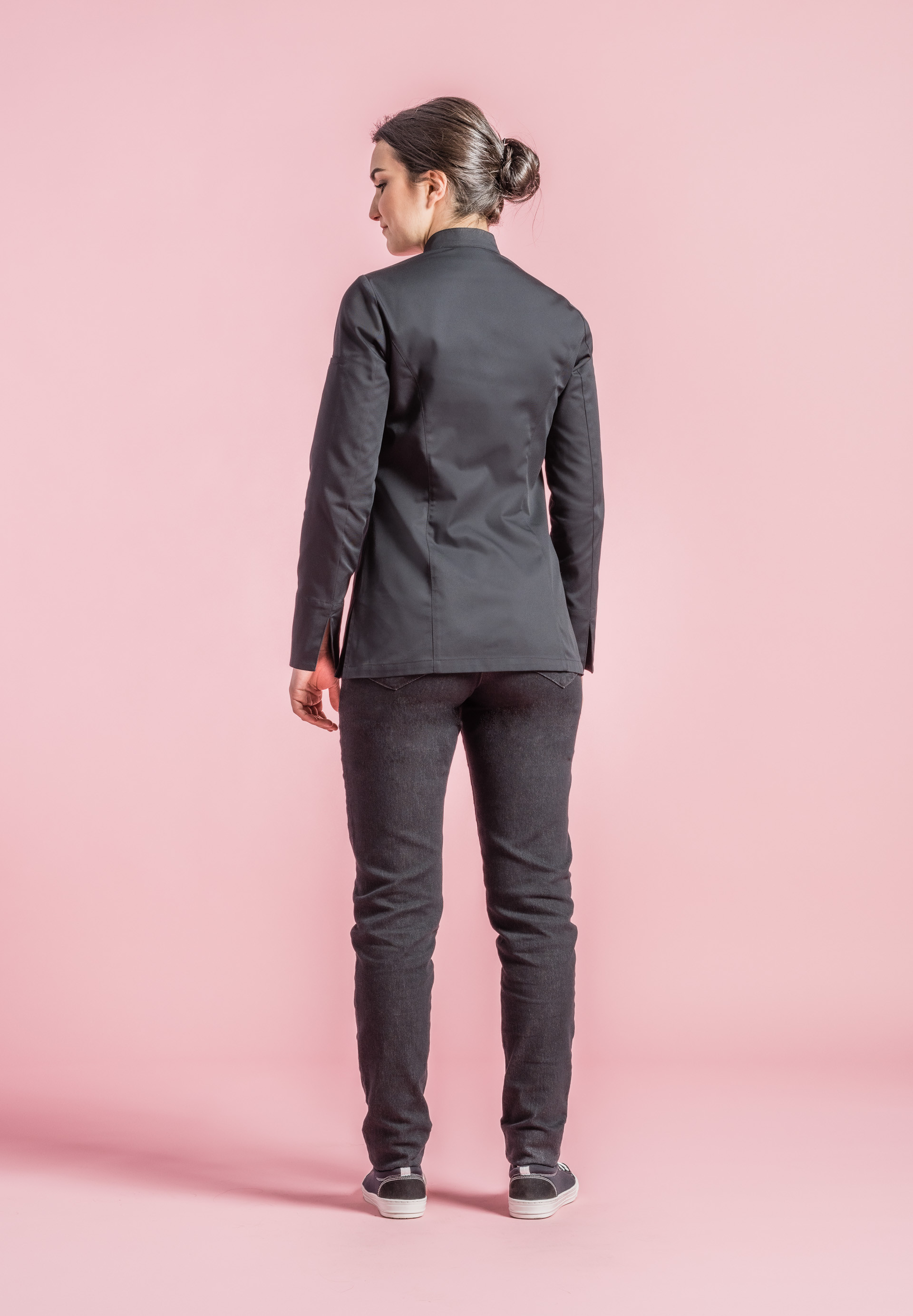 Chaqueta de mujer con cuello de oficial cuadrado , botones automáticos escondidos, bolsillo en la manga izquierda, aberturas laterales