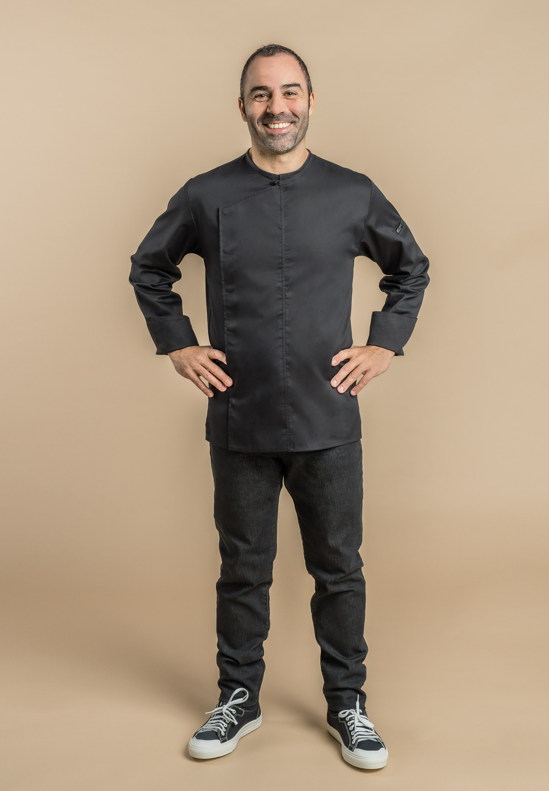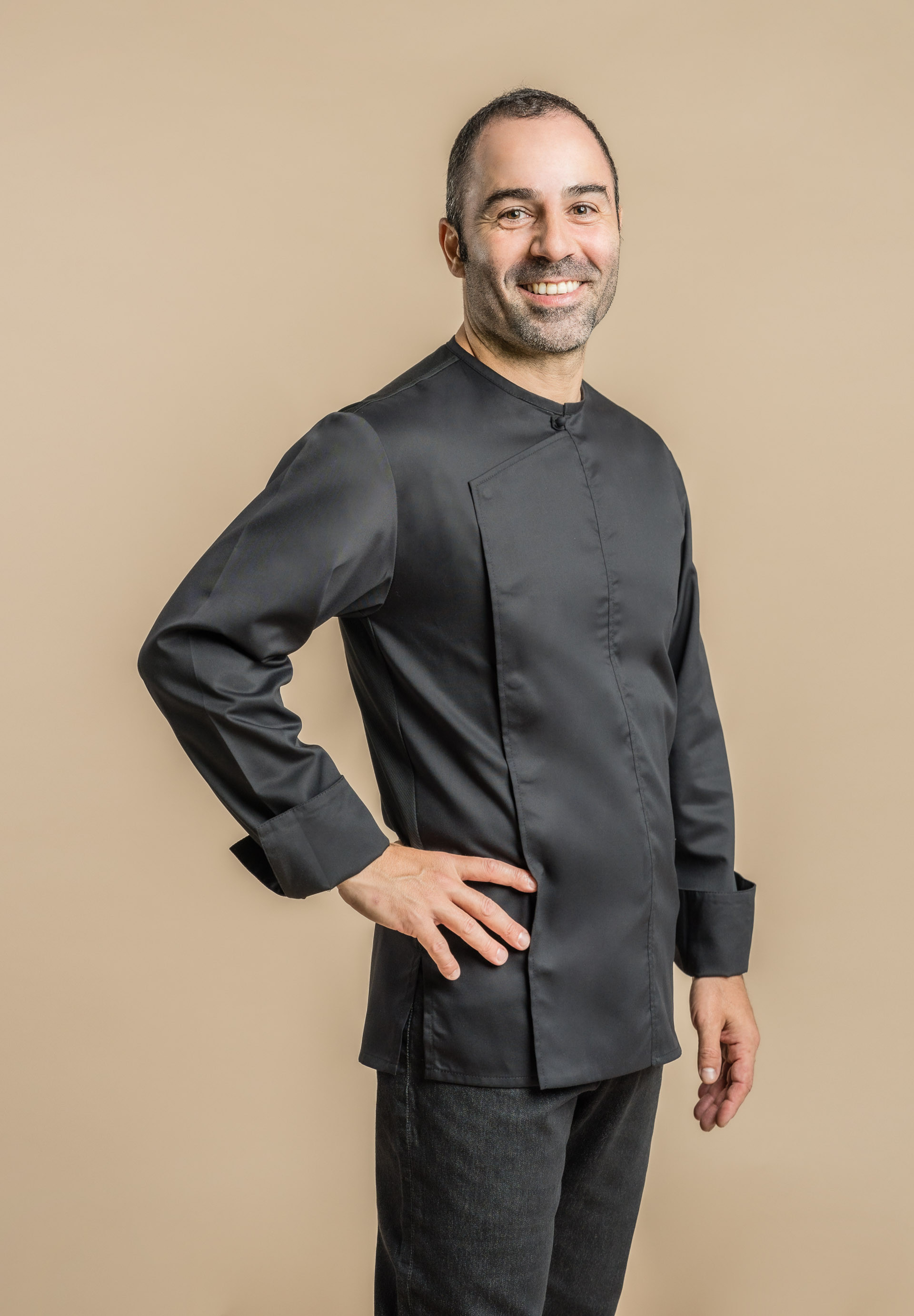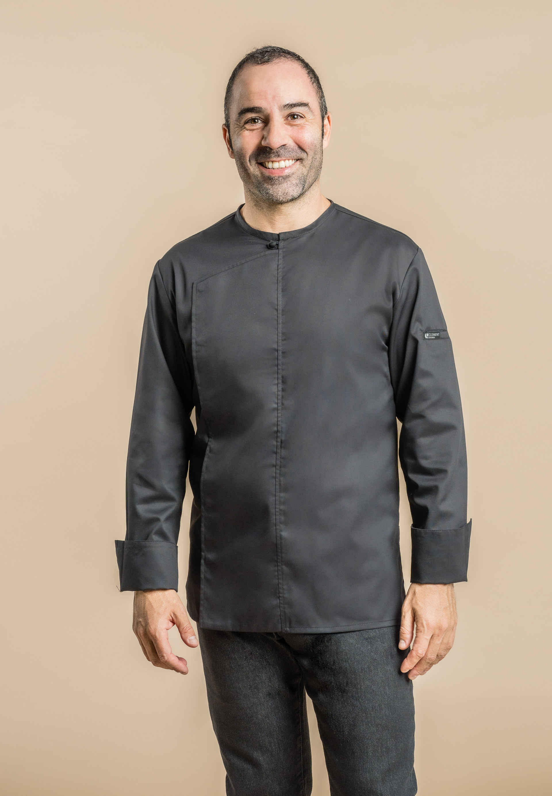 Chaqueta de hombre de cocina ligera y confortable con botones automáticos escondidos, bolsillo ribeteado en el pecho, aberturas laterales