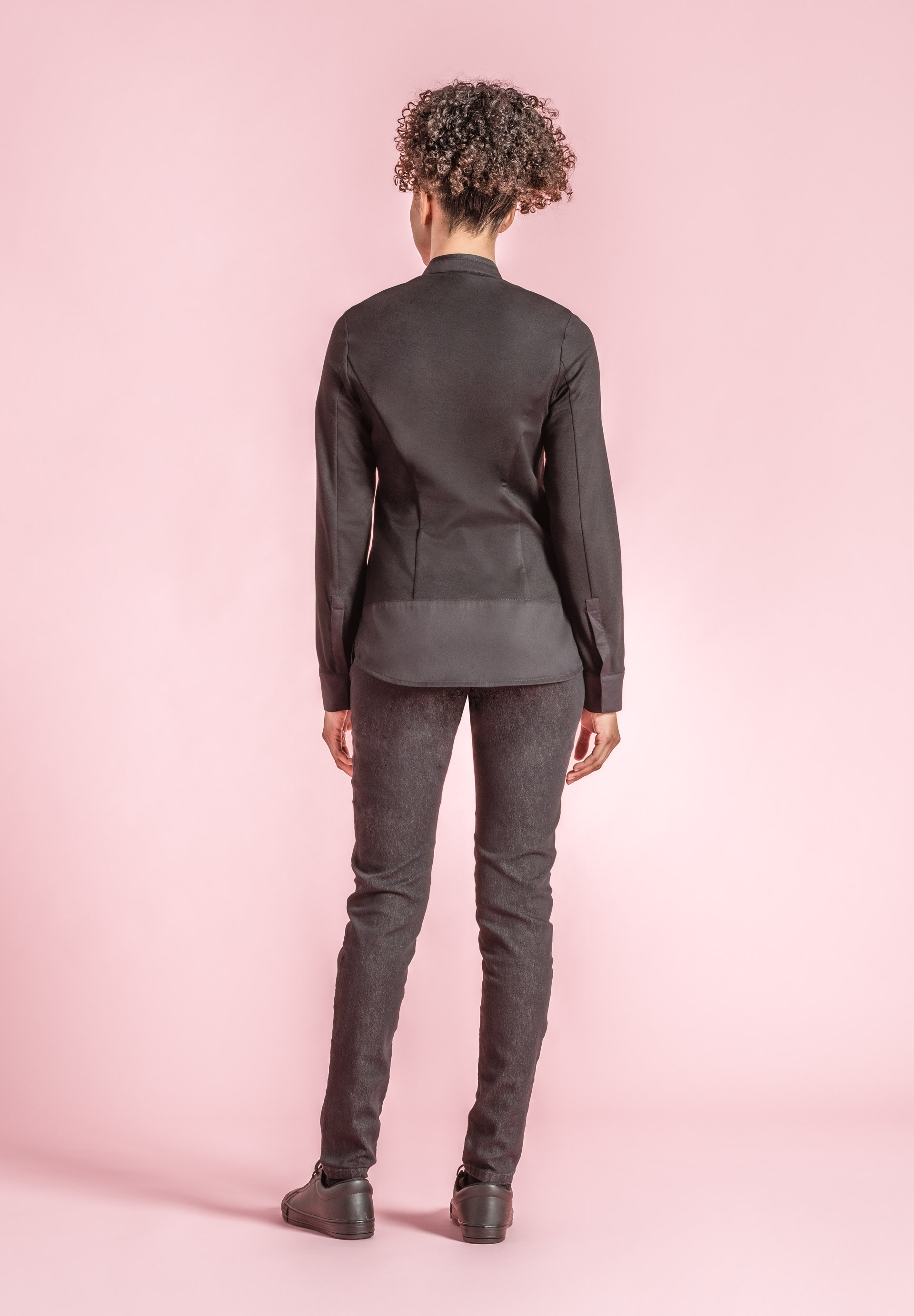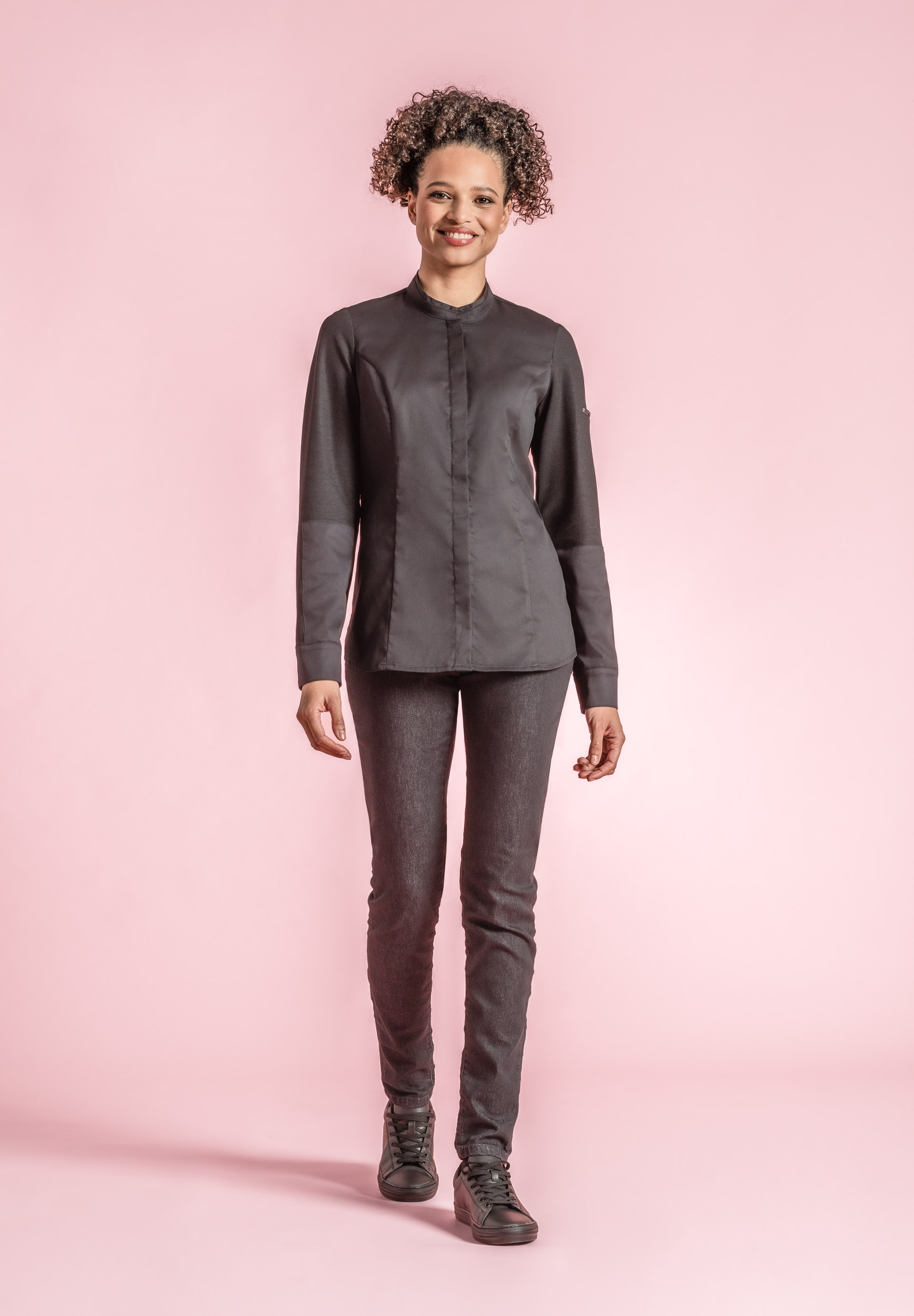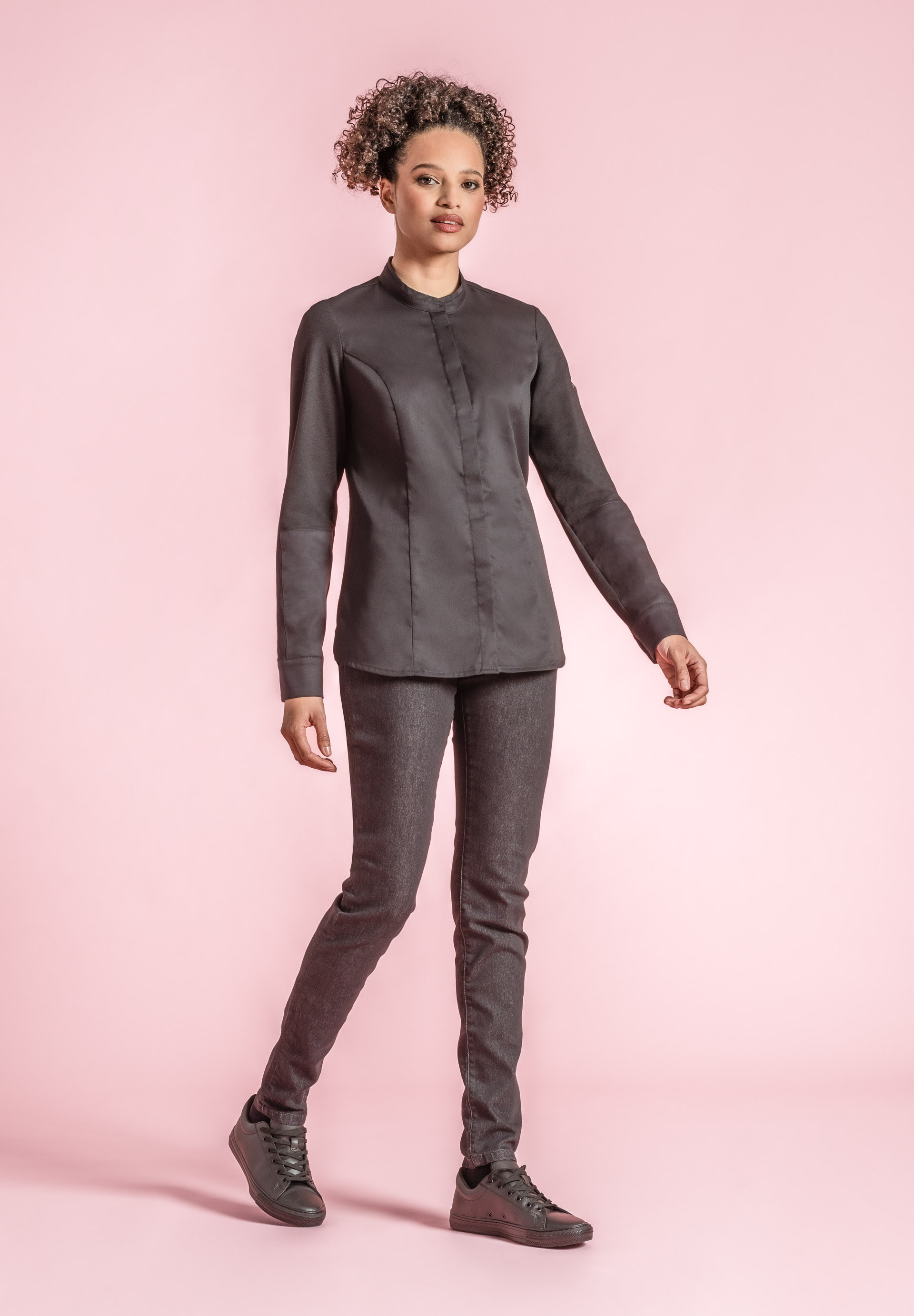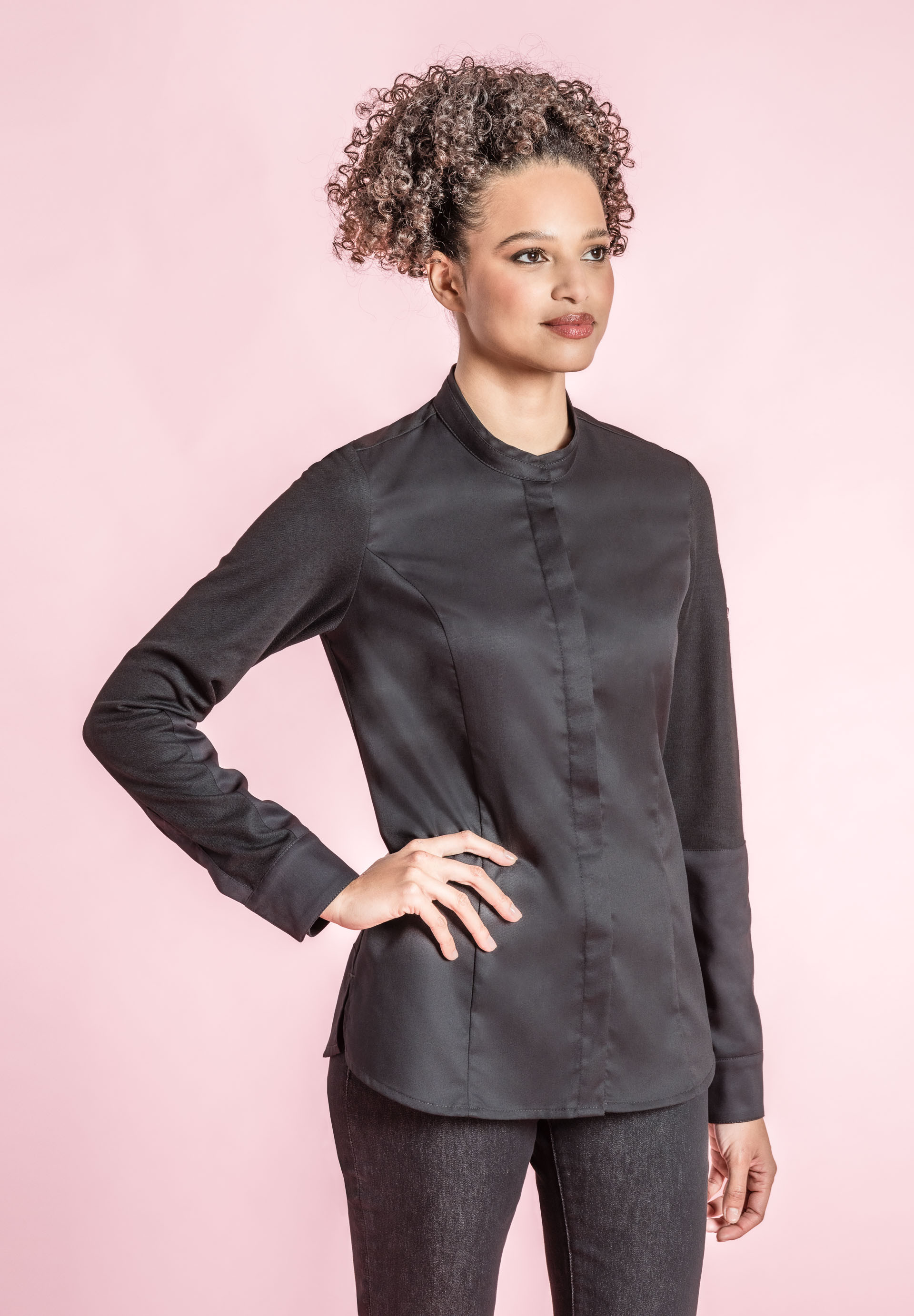 Women's kitchen jacket with small stand collar. Fitted cut.