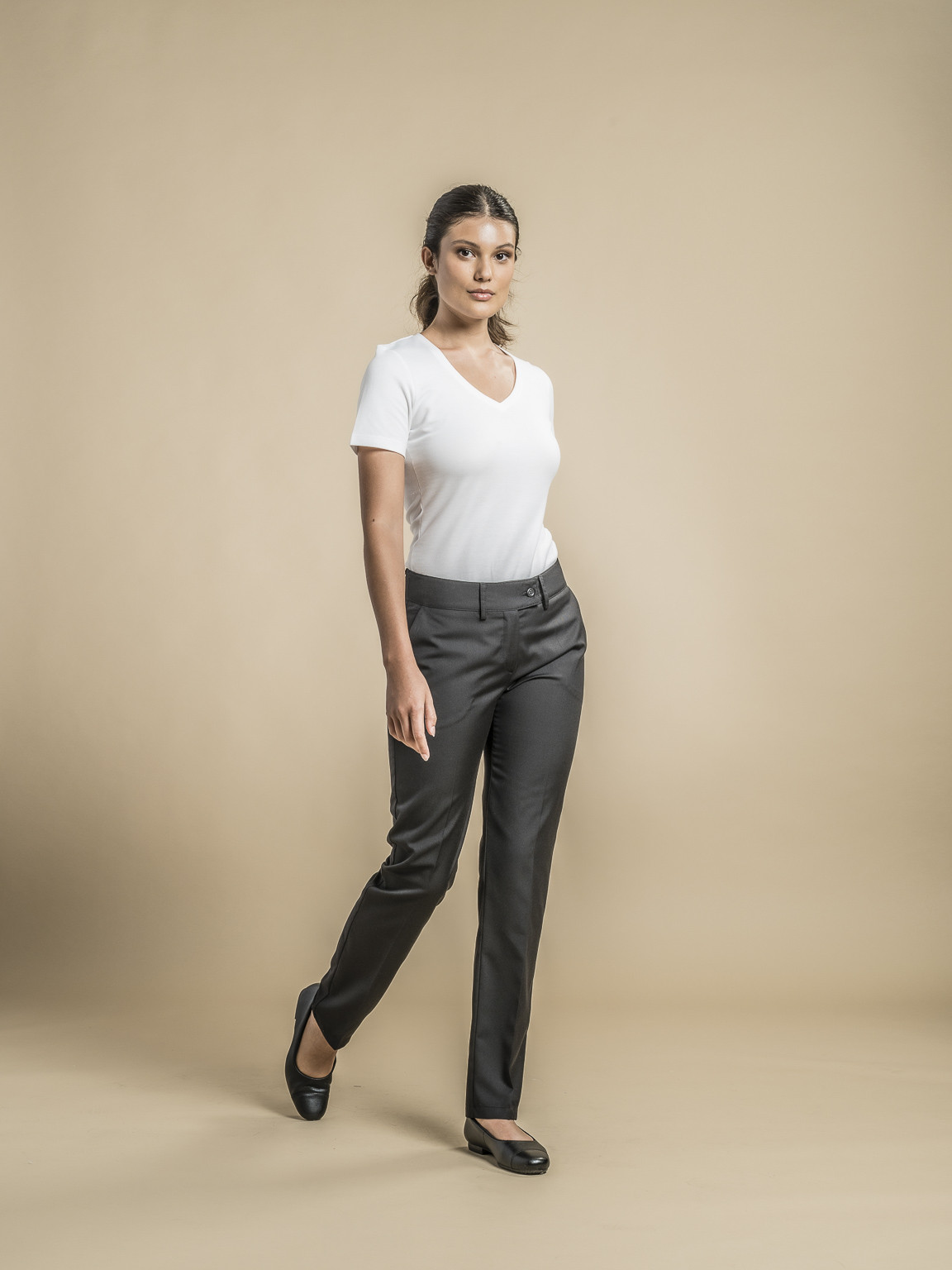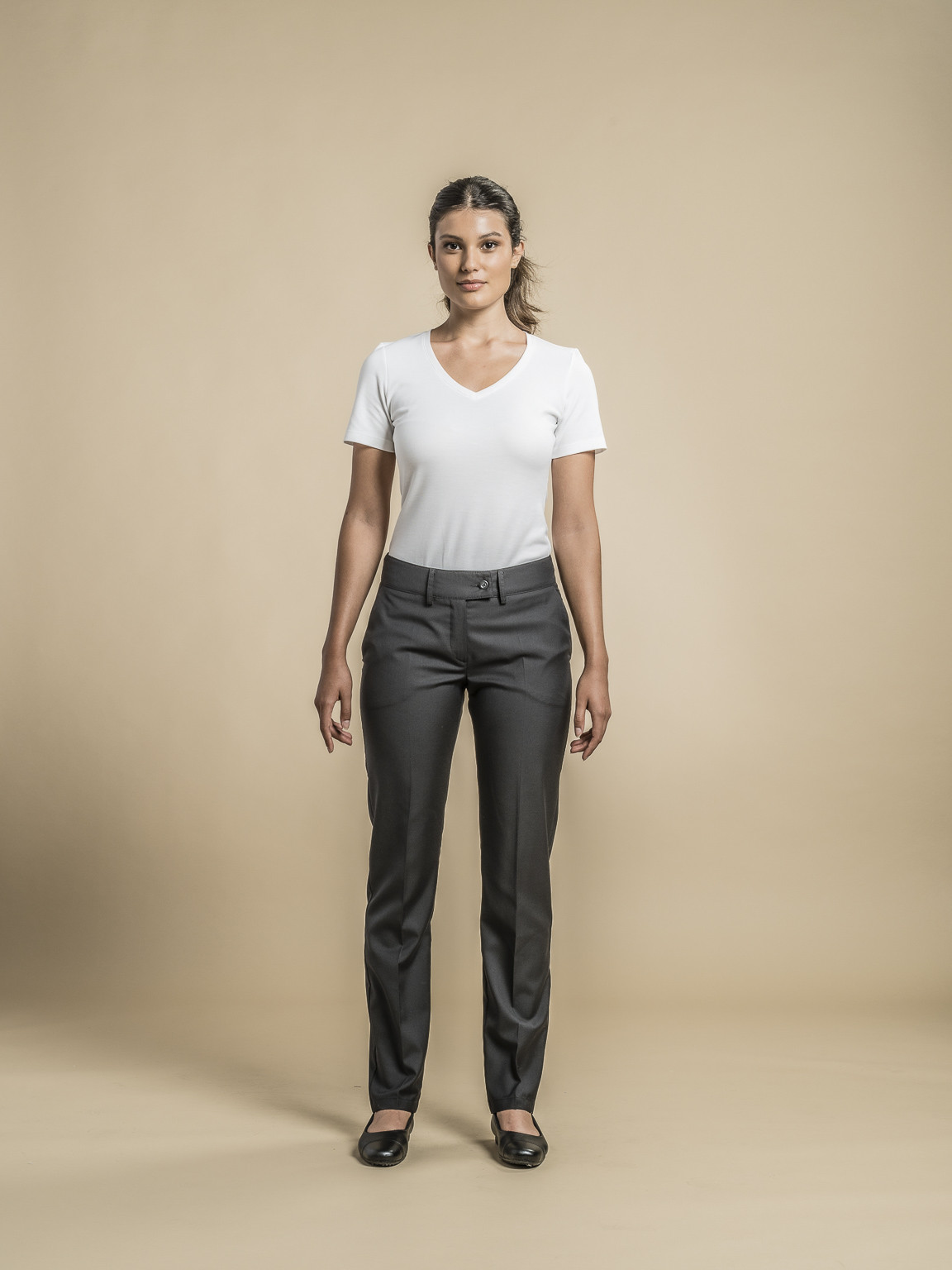 Pantalon femme coupe fittée avec ceinture à passants et crochet.