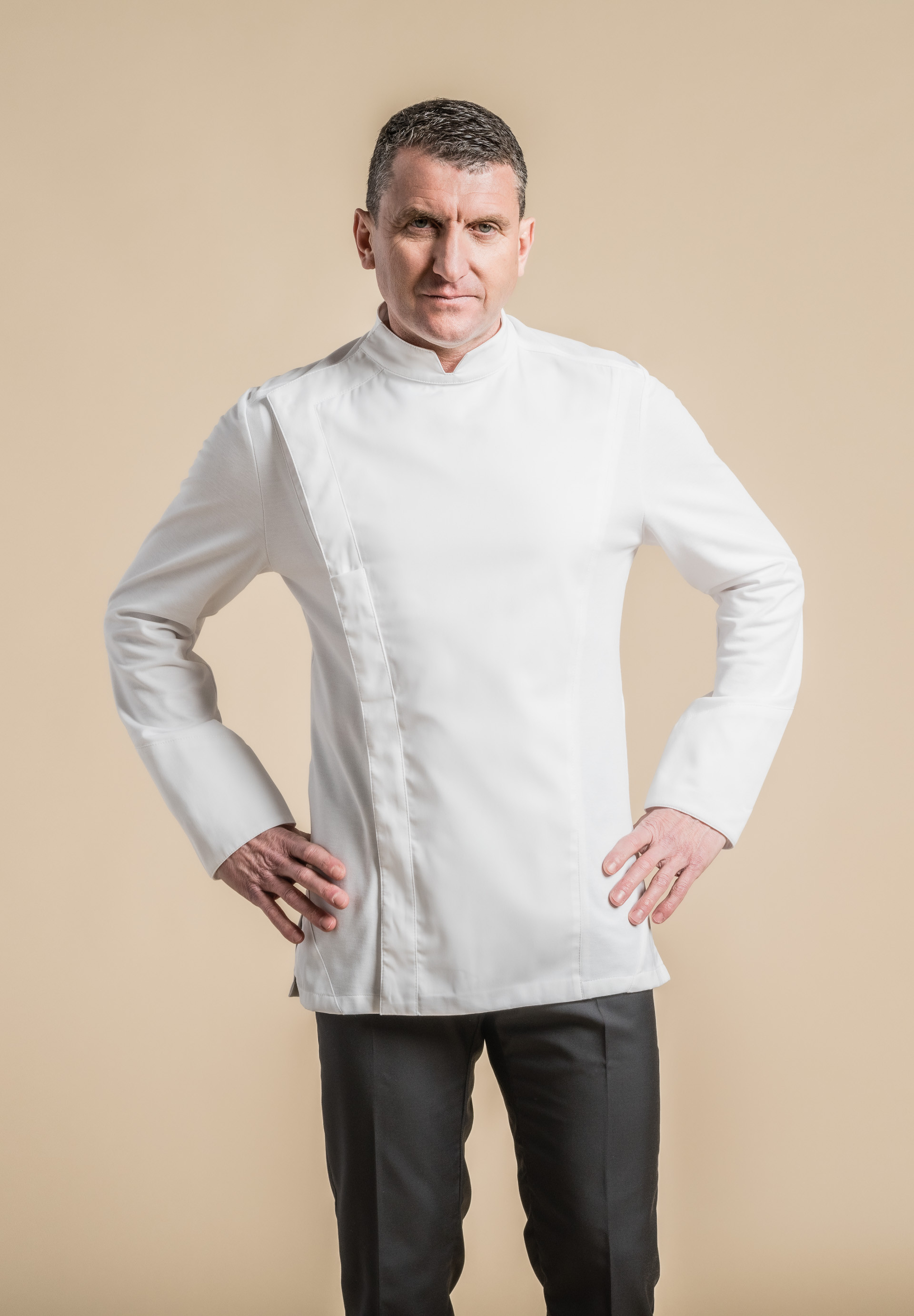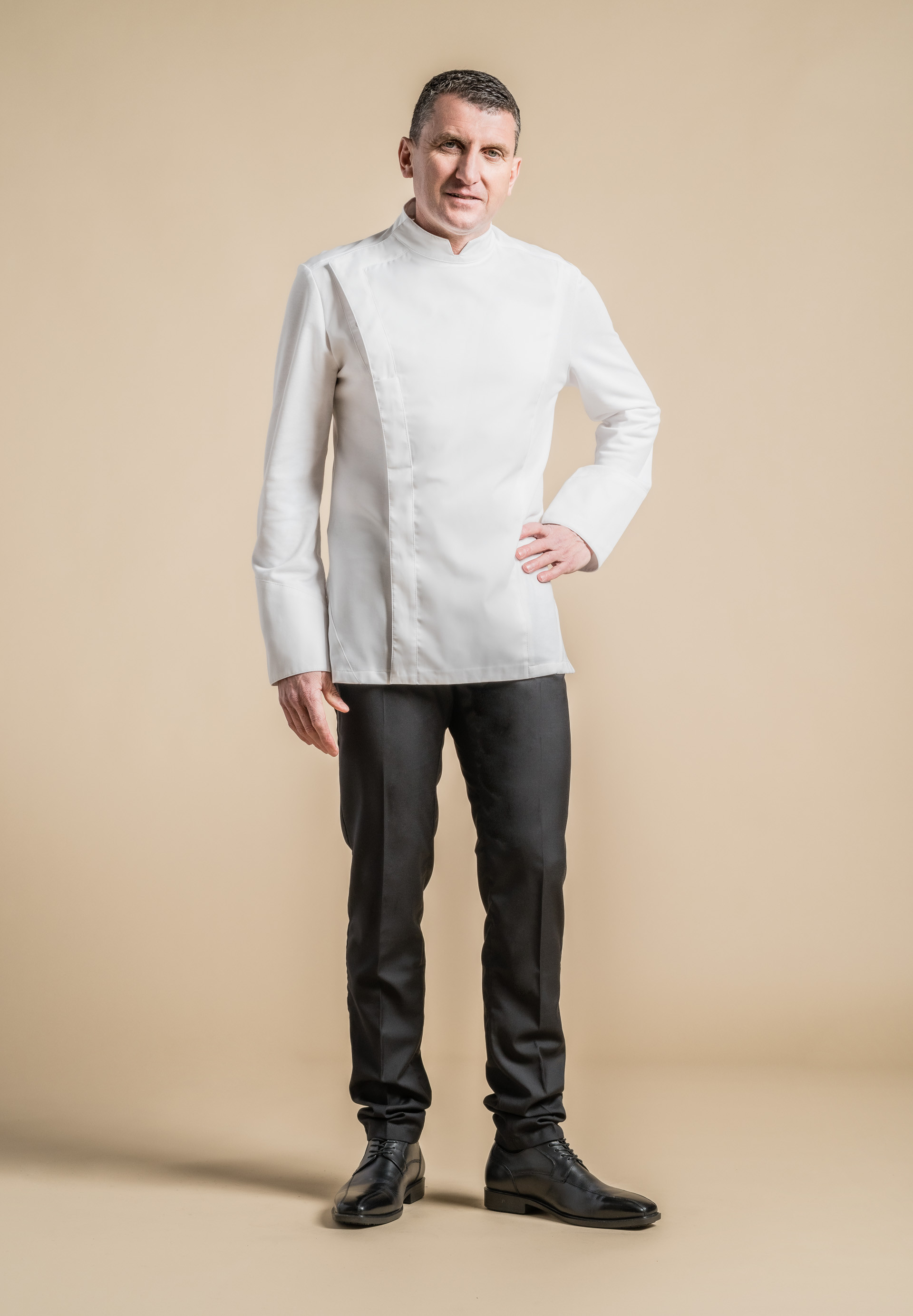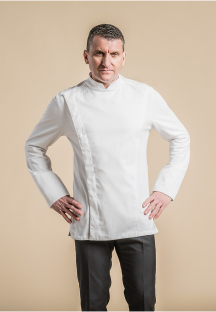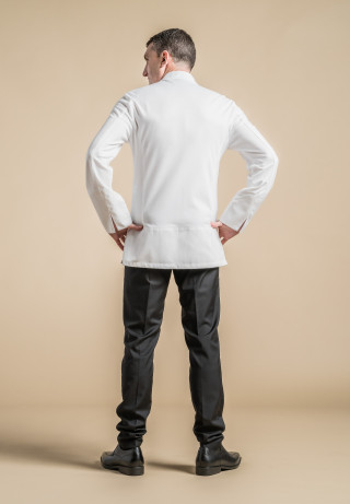 Giacca uomo da cucina con collo alla coreana, bottoni a pressione nascosti, taschino per penna a filetto lungo la patta di abbottonatura asimmetrica, spacchi laterali