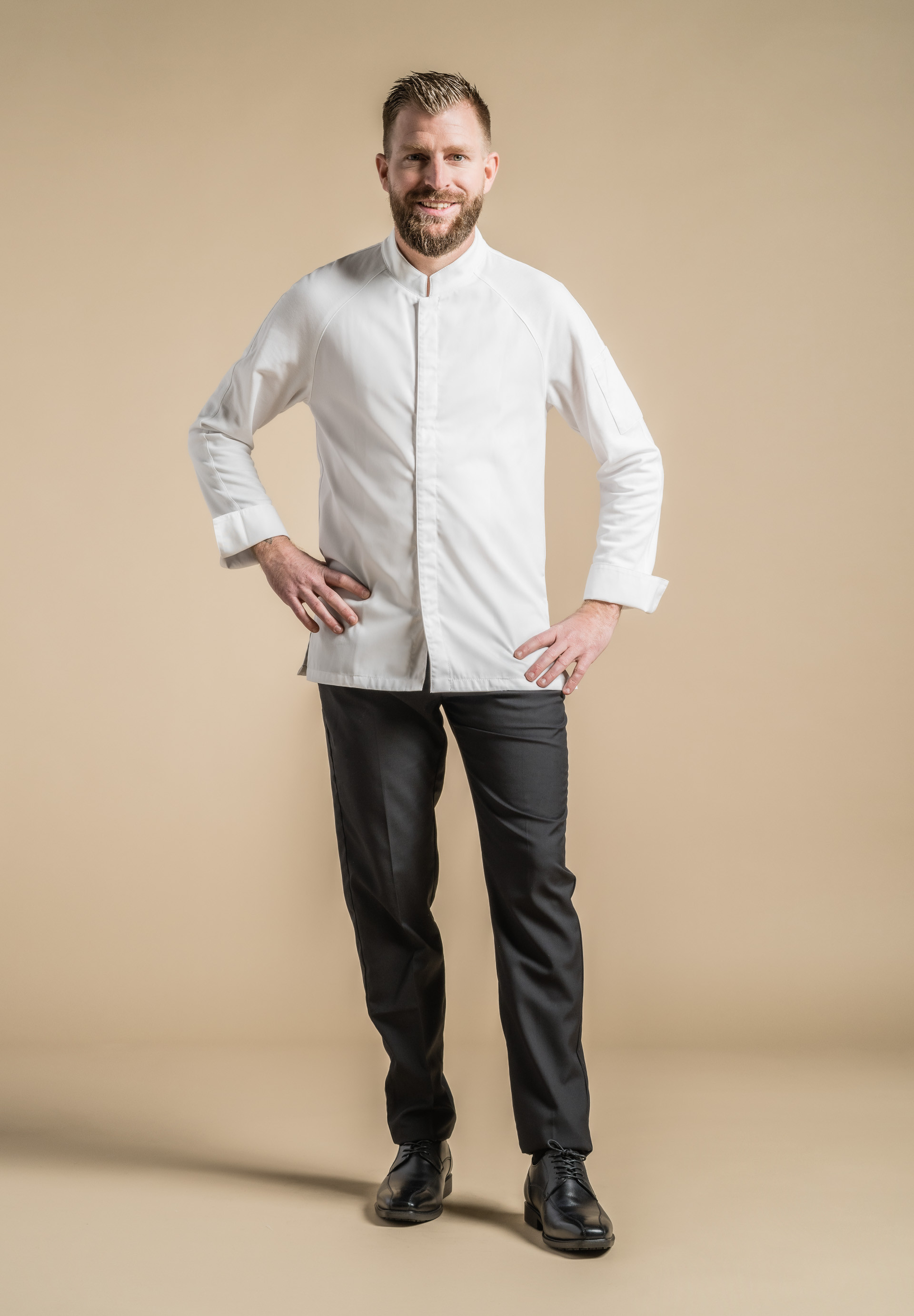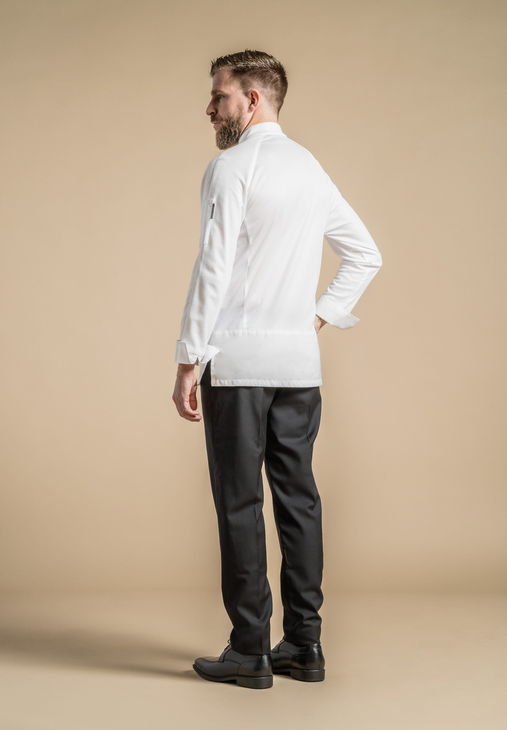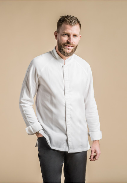 Giacca uomo da cucina con collo alla coreana, maniche a raglan, bottoni a pressione nascosti, taschino per penna sulla manica sinistra, spacchi laterali