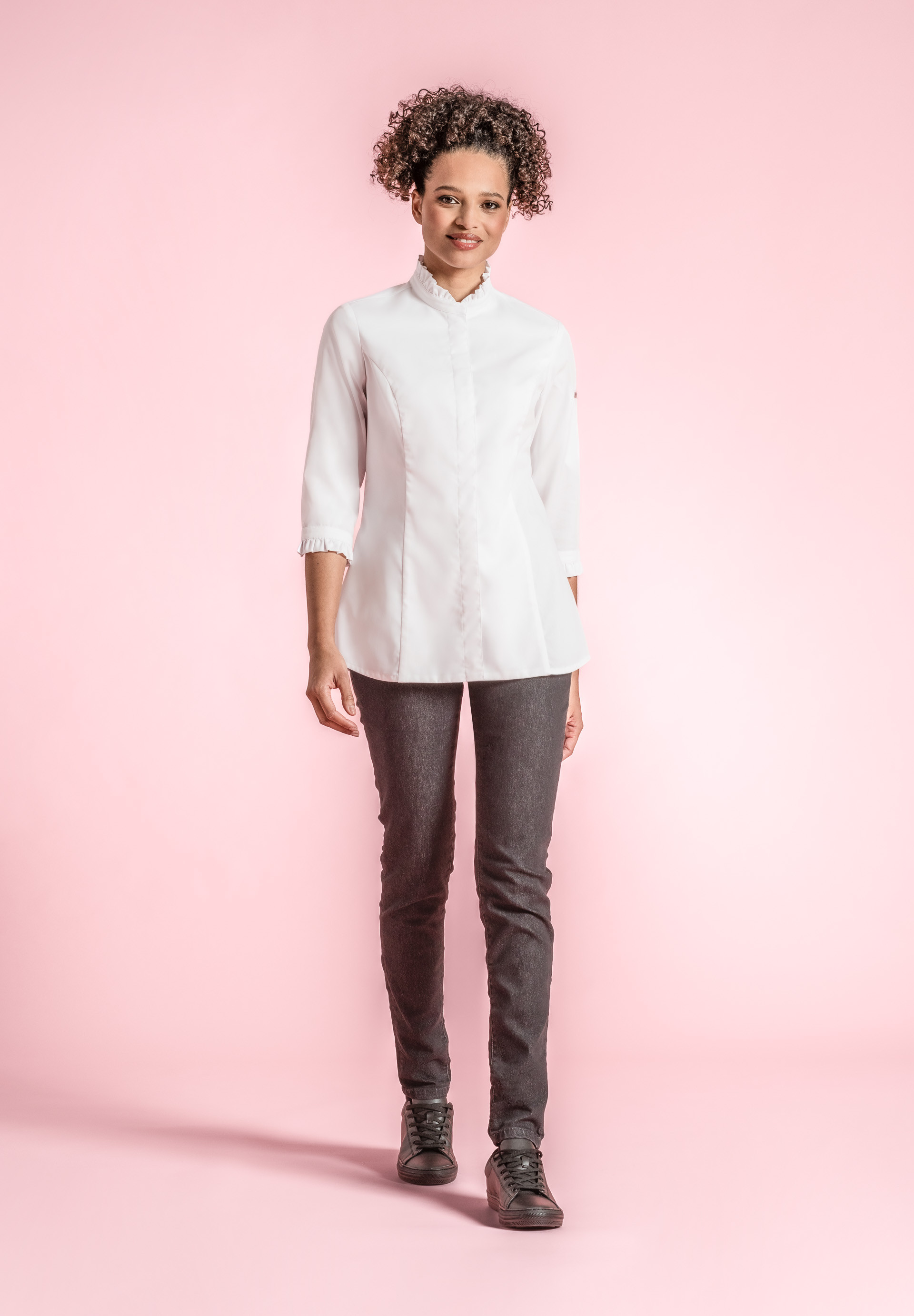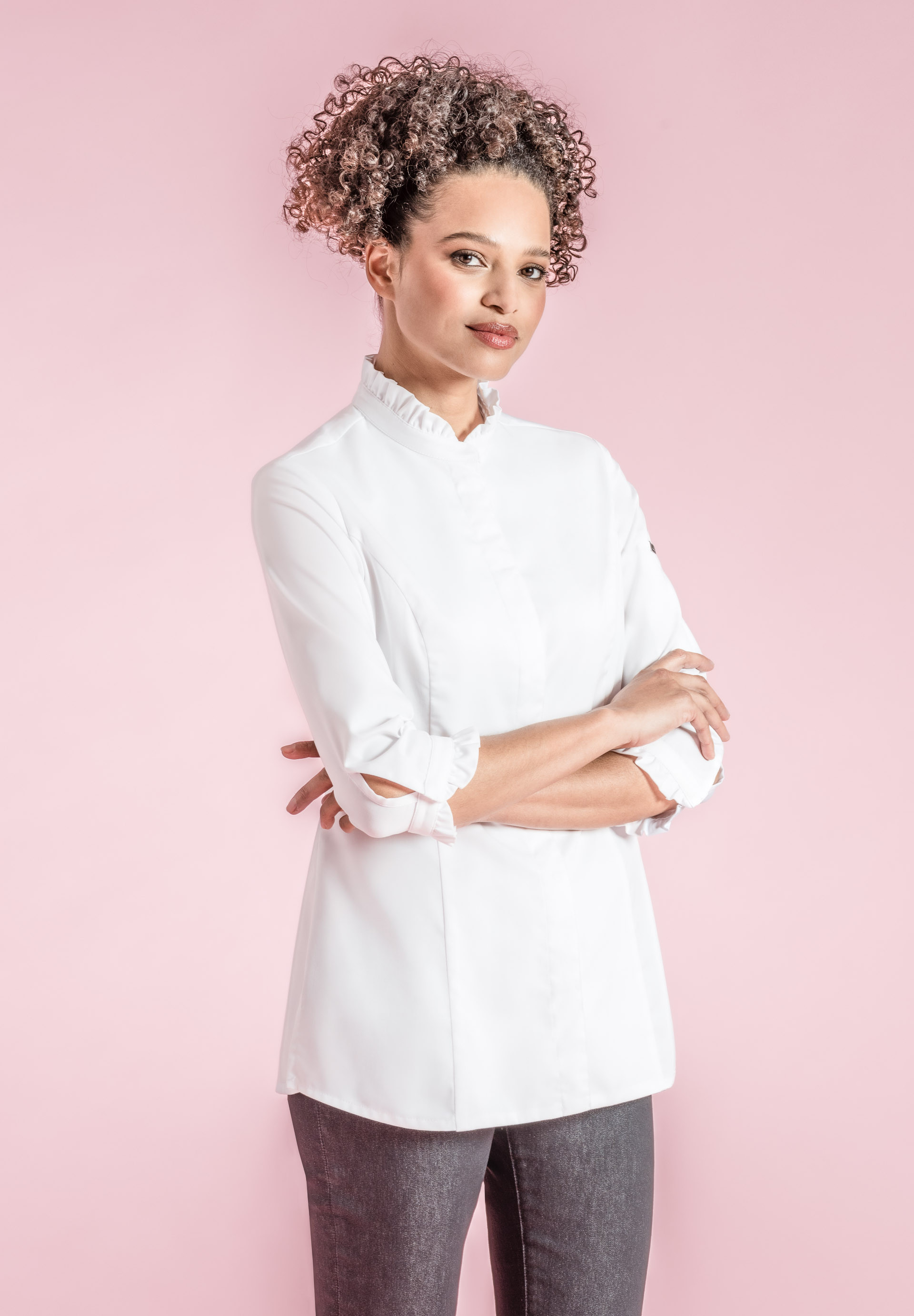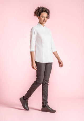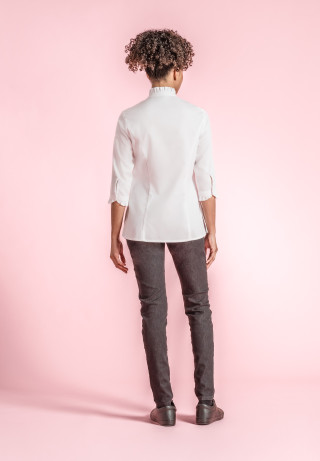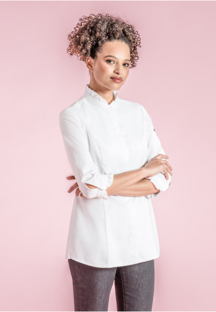Giacca da cucina da donna con colletto vittoriano ornato da arricciature